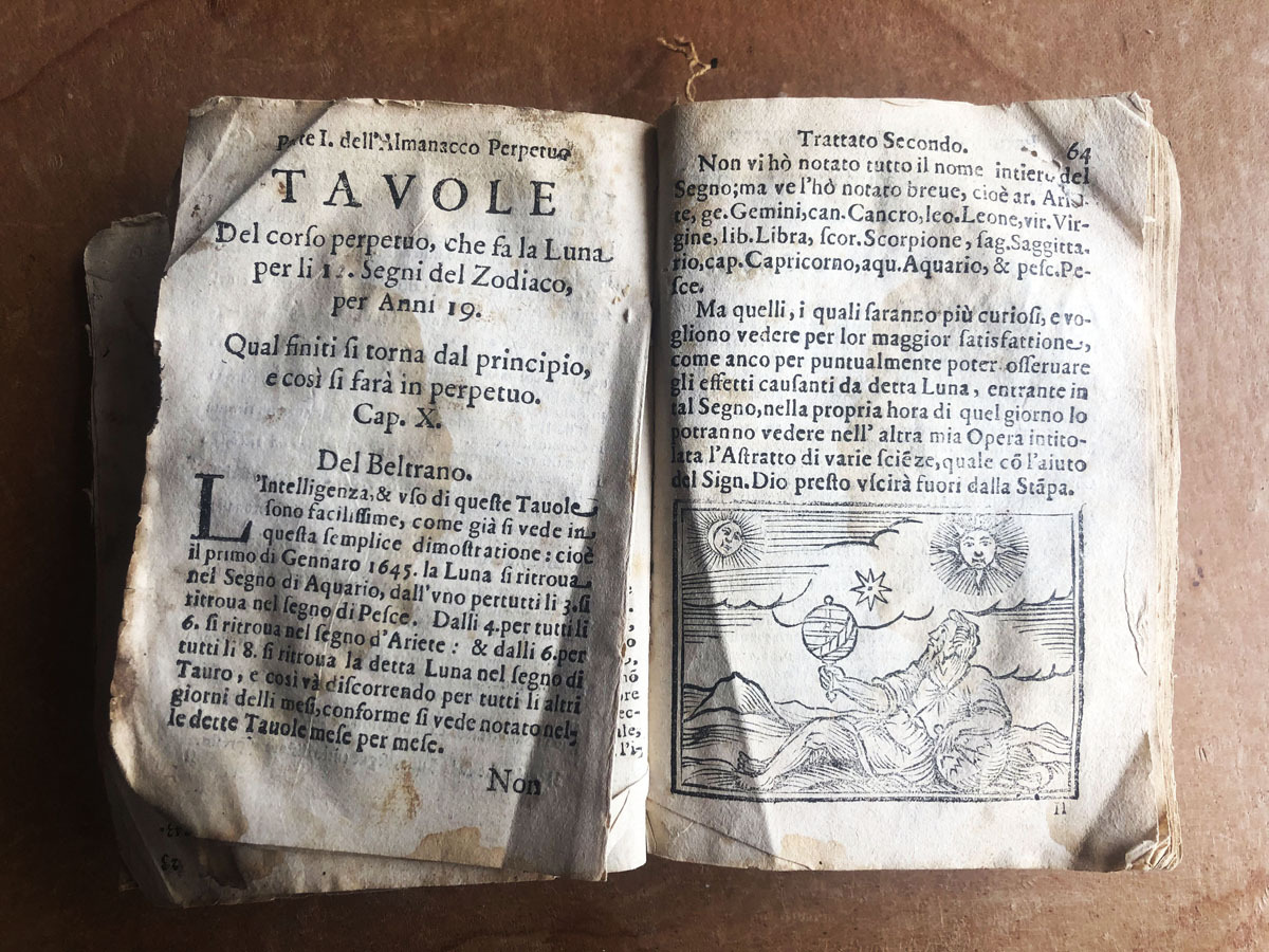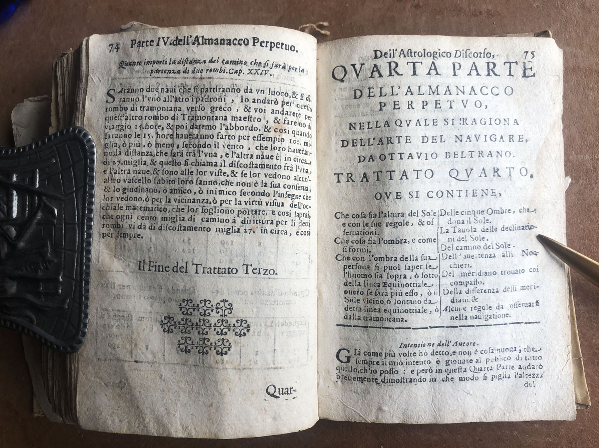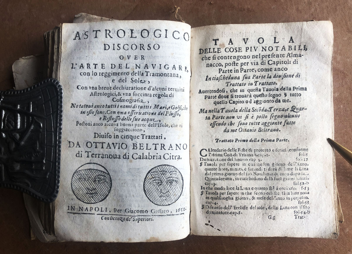 Astrologico // Discorso // over // L’arte del navigare, // con lo reggimento della Tramontana, // e del Sole, // Con una breue dechiaratione d’alcuni termini // Astrologici, & una succinta regola di // Cosmografia, // Notatoni ancotutii i nomi di tuttii Mari, e golfi che // in esso sone. Con una osseruatione del Flusso, // e Reflusso delle sue aquae. // Postoui anco alcuna buona parte dell’isole, che vi // sogiacciono // Diuiso in cinque Trattati. // Da Ottavio Beltrano // di Terranova di Calabria Citra. // In Napoli, per Giacomo Gastaro, 1651 // Con licenza de superiori.