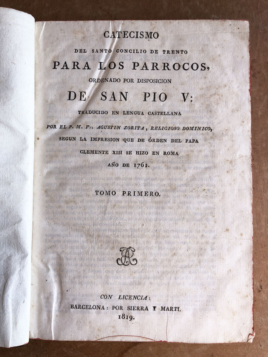 Catecismo // del Santo Concilio de Trento // Para los párrocos, // ordenado por disposición // de San Pio V: // Traducido en Lengua Castellana // por el P. M. Fr. Agustin Zorita, Religioso Dominico, // segun la Impresion que de órden del Papa // Clemente XIII se Hizo en Roma // año 1761 // Tomo Primero. // Con Licencia: // Barcelona: por Sierra y Martí. // 1819