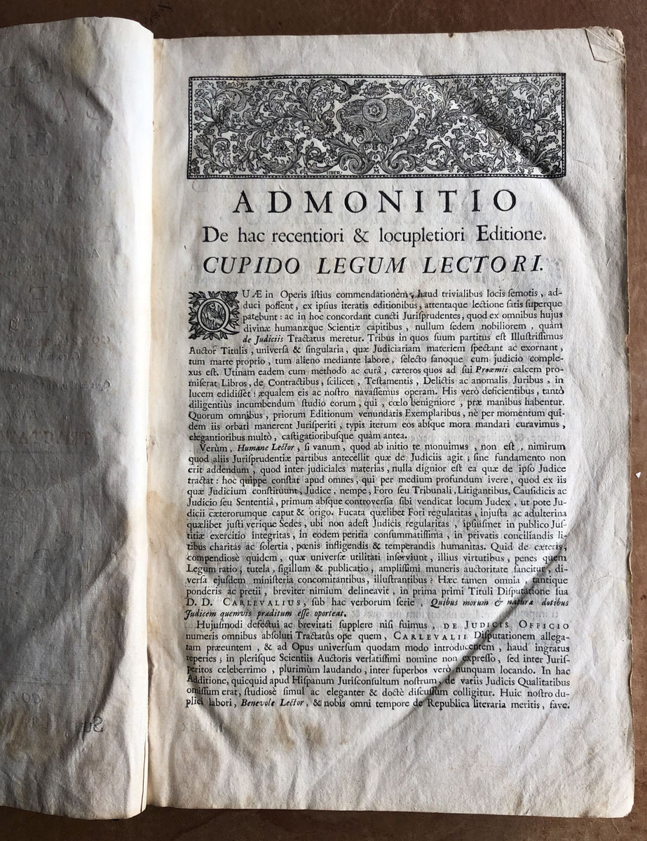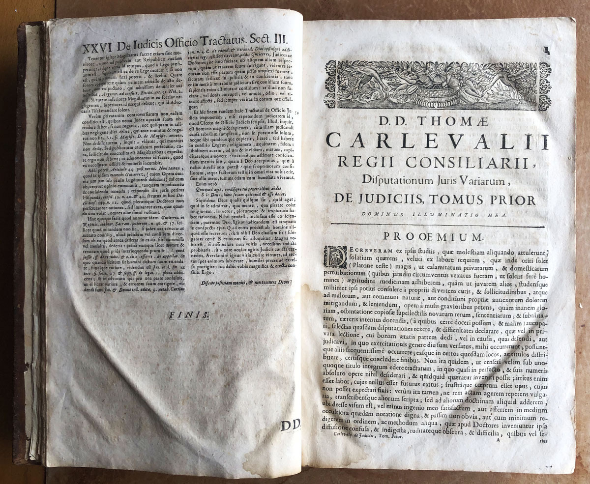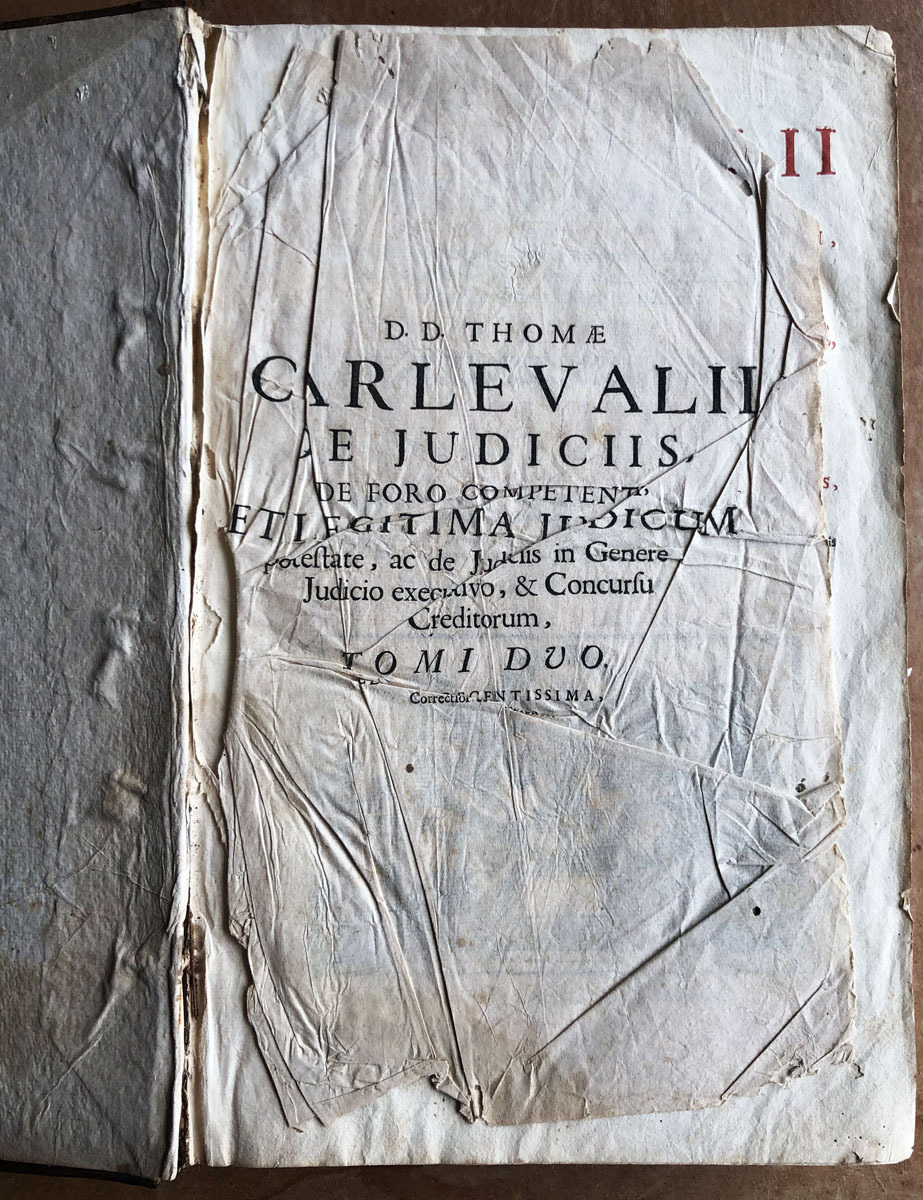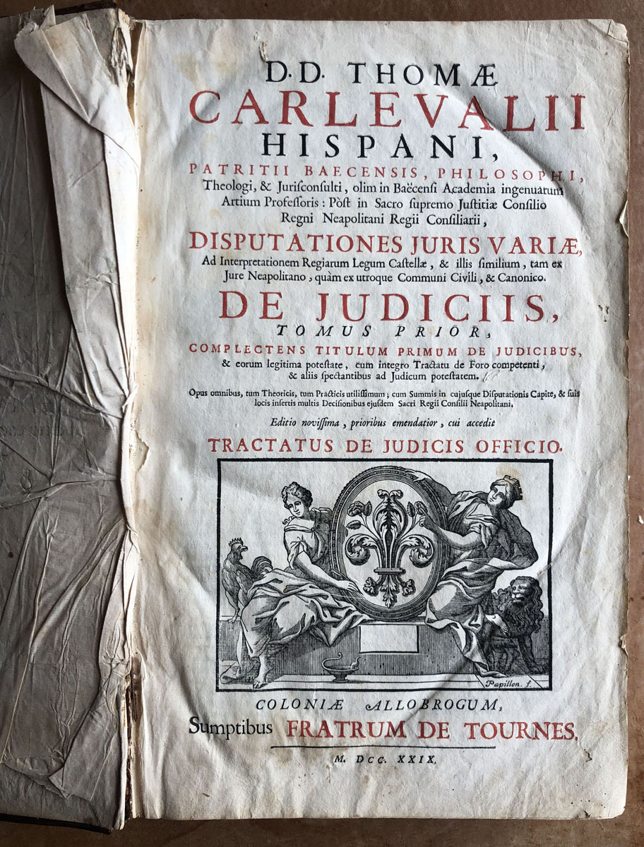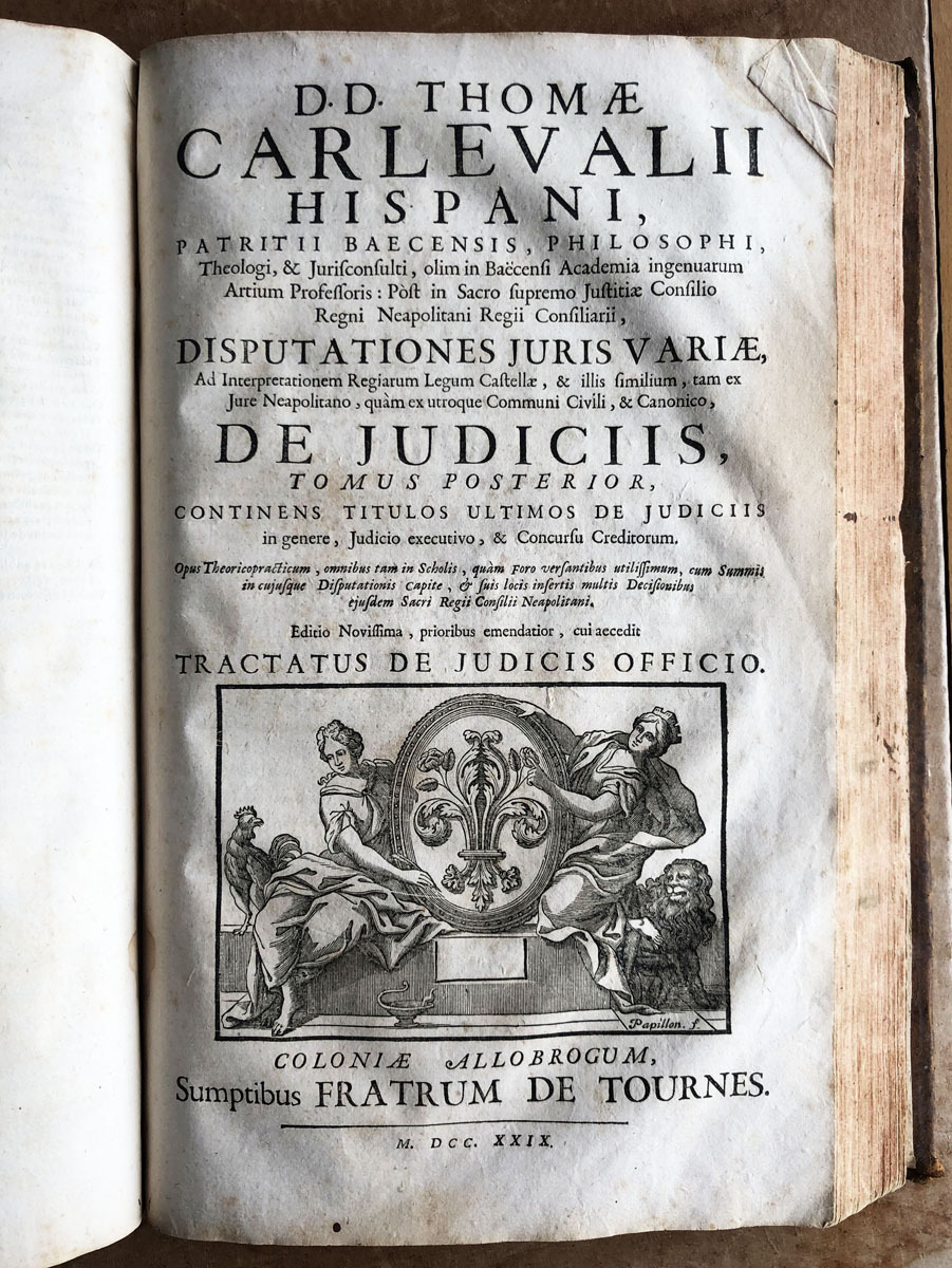 D. D. Thomae // Carlevalii // Hispani, // Patritii Baecensis, Philosophi, // Theologi, & Jurisconsulti, olim Baecensi Adademia ingenuarum // Atrium Professoris :Post in sacro supremo Justitia Concilio // Regni Neapolitani Regii Consiliari //, Disputationes Juris Variae // Ad Interpretationen Regiarum Legum Castellae, & illis similium, tam ex // jure Neapolitano, quam ex utroque Communi Civili, & Canonico. // De Judicis, Tomus Prior, //complectems titulum Primum de Judicibus, // & eorum legitima potestate; cum integro Tractatus de Foro comerendi, // & aliis spectantibus ad Judicum potestaten. // Opus onnibus, tum Theoricis, tum Practicis utilissimum; cum Summis in cujusque Diputationis Capite, & // fuis locis inferris multis decisionibus ejusdem Sacri Regii Consilii Neopolitani. // Editio novissima, prioribus emendatior, cui accedit // trattatus de judicis de officio. // Coloniae Allobrogum, // Sumptibus Fratrum de Tournes, // M. DCC. XXIX.