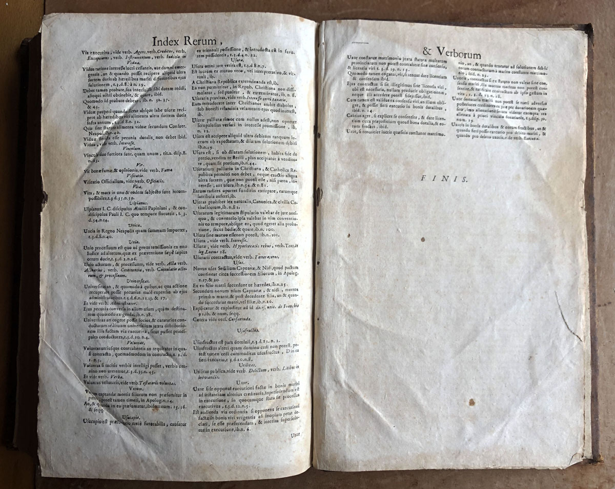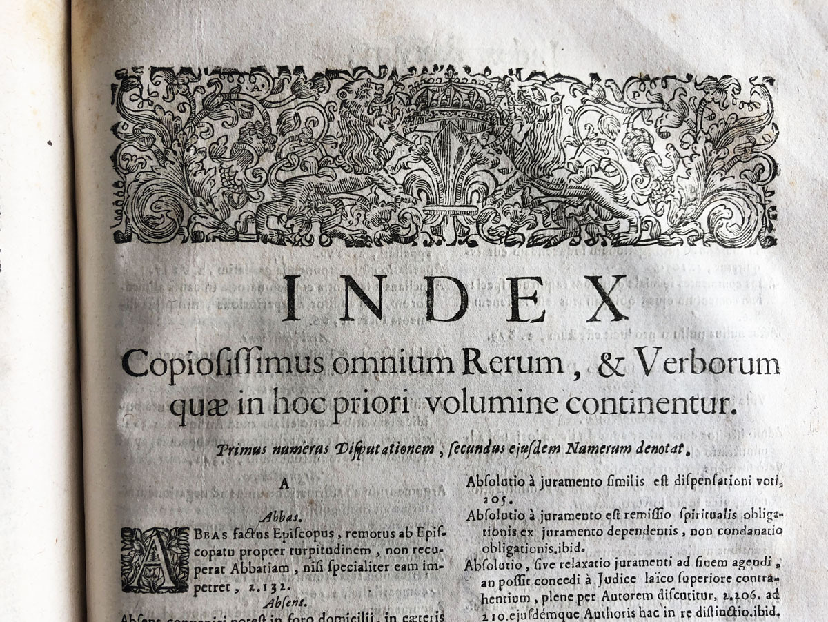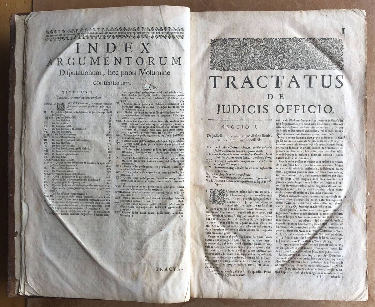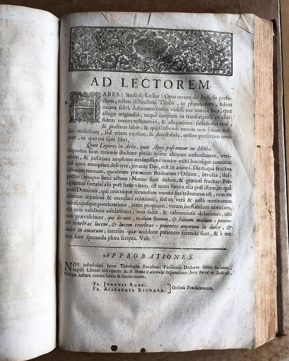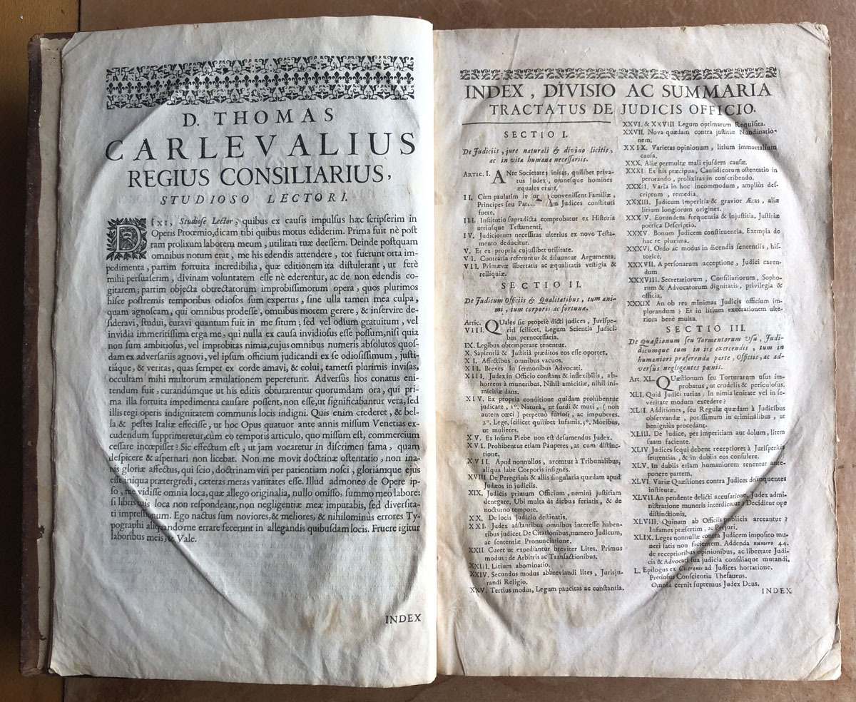 D. D. Thomae // Carlevalii // Hispani, // Patritii Baecensis, Philosophi, // Theologi, & Jurisconsulti, olim Baecensi Adademia ingenuarum // Atrium Professoris :Post in sacro supremo Justitia Concilio // Regni Neapolitani Regii Consiliari //, Disputationes Juris Variae // Ad Interpretationen Regiarum Legum Castellae, & illis similium, tam ex // jure Neapolitano, quam ex utroque Communi Civili, & Canonico. // De Judicis, Tomus Prior, //complectems titulum Primum de Judicibus, // & eorum legitima potestate; cum integro Tractatus de Foro comerendi, // & aliis spectantibus ad Judicum potestaten. // Opus onnibus, tum Theoricis, tum Practicis utilissimum; cum Summis in cujusque Diputationis Capite, & // fuis locis inferris multis decisionibus ejusdem Sacri Regii Consilii Neopolitani. // Editio novissima, prioribus emendatior, cui accedit // trattatus de judicis de officio. // Coloniae Allobrogum, // Sumptibus Fratrum de Tournes, // M. DCC. XXIX.