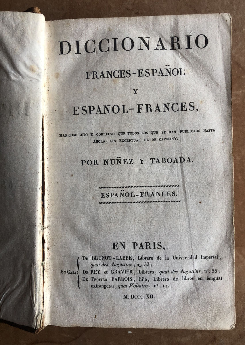 Diccionario // Frances-Español // y // Espanol-Frances, // mas completo y correcto que todos los que se han publicado hasta // ahora, sin exceptuar el de Capmany. // por Nuñez y Taboada. // Español-Frances // En Paris, // En Casa // De Brunot- Labbe, Librero de la Universidad Imperial, // quai des Augustins, nº 33; // De Rey et Gravier, Librero, quai des Augustins, nº 55; // De Teofilo Barrois, hijo, librero de libros en lenguas extrangeras, quai Voltaire, nº II. // MDCCCXII