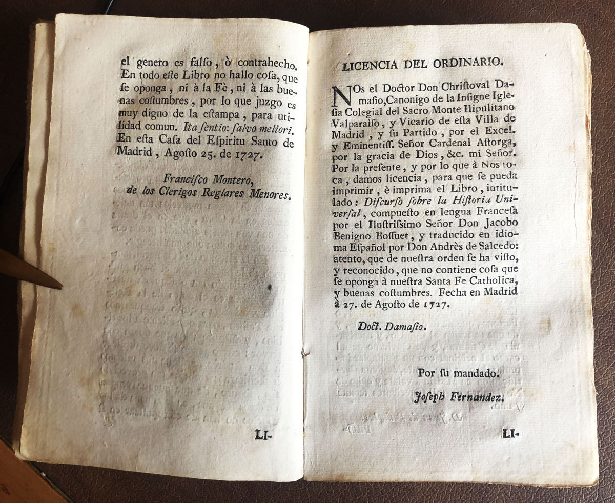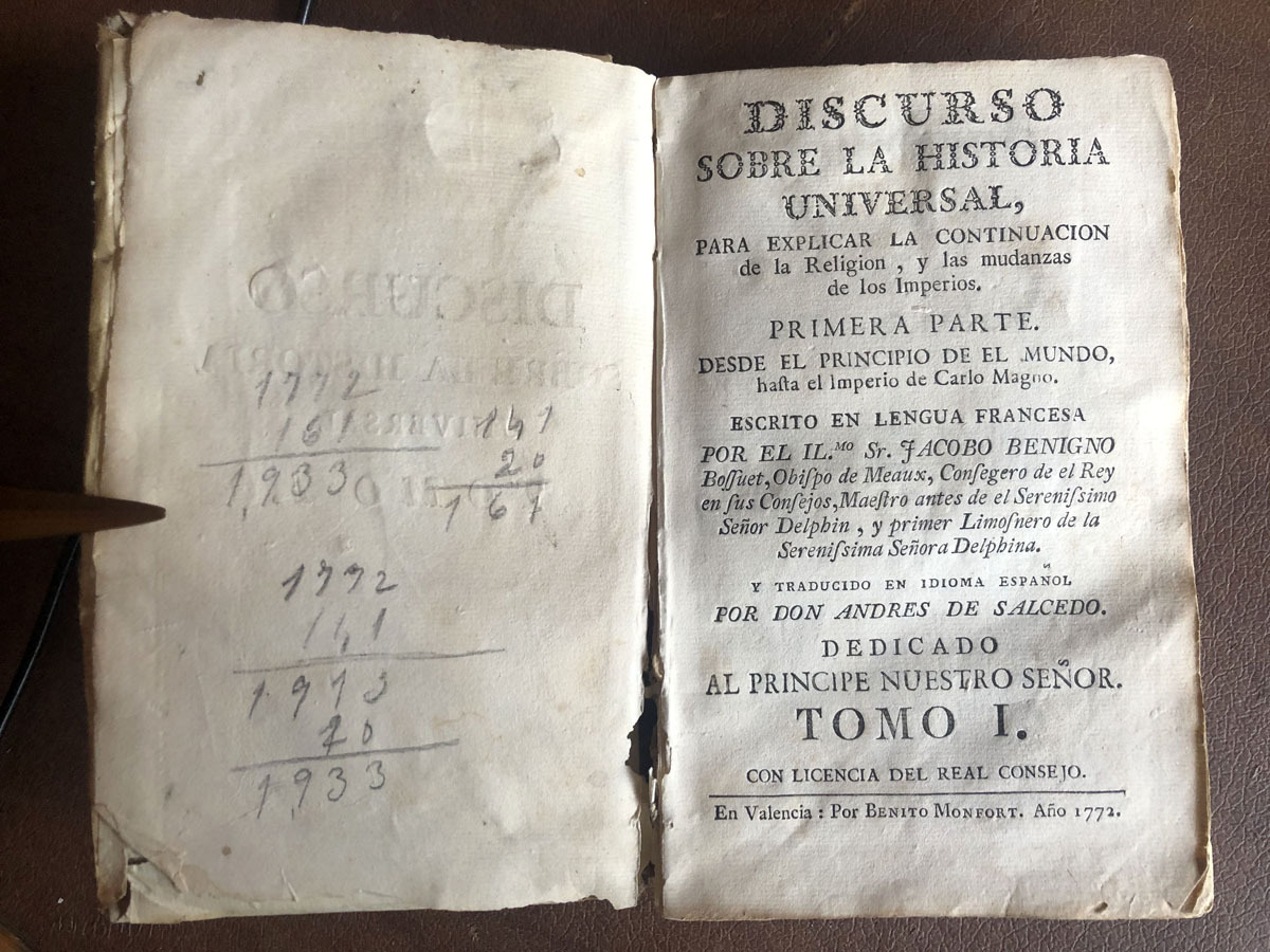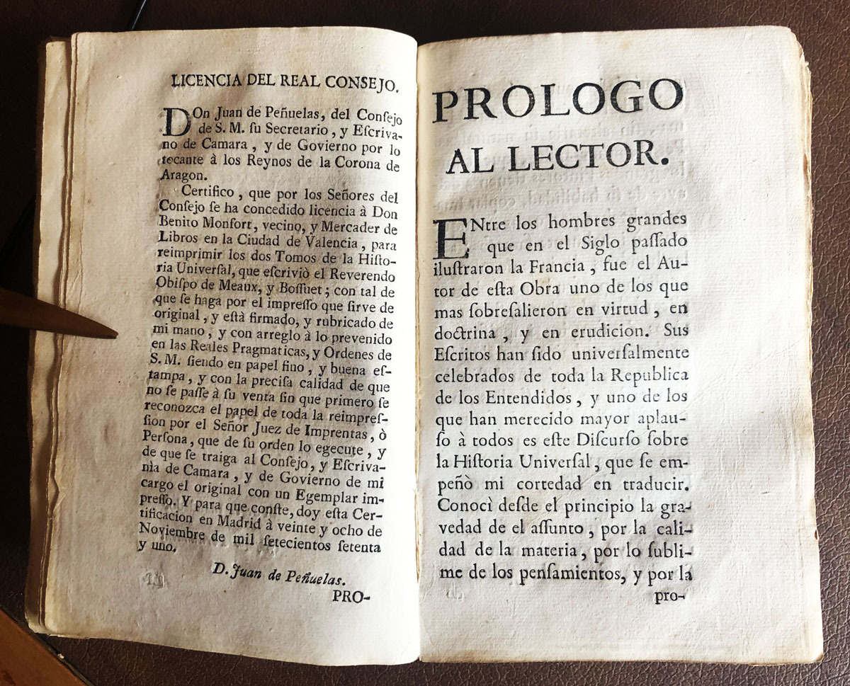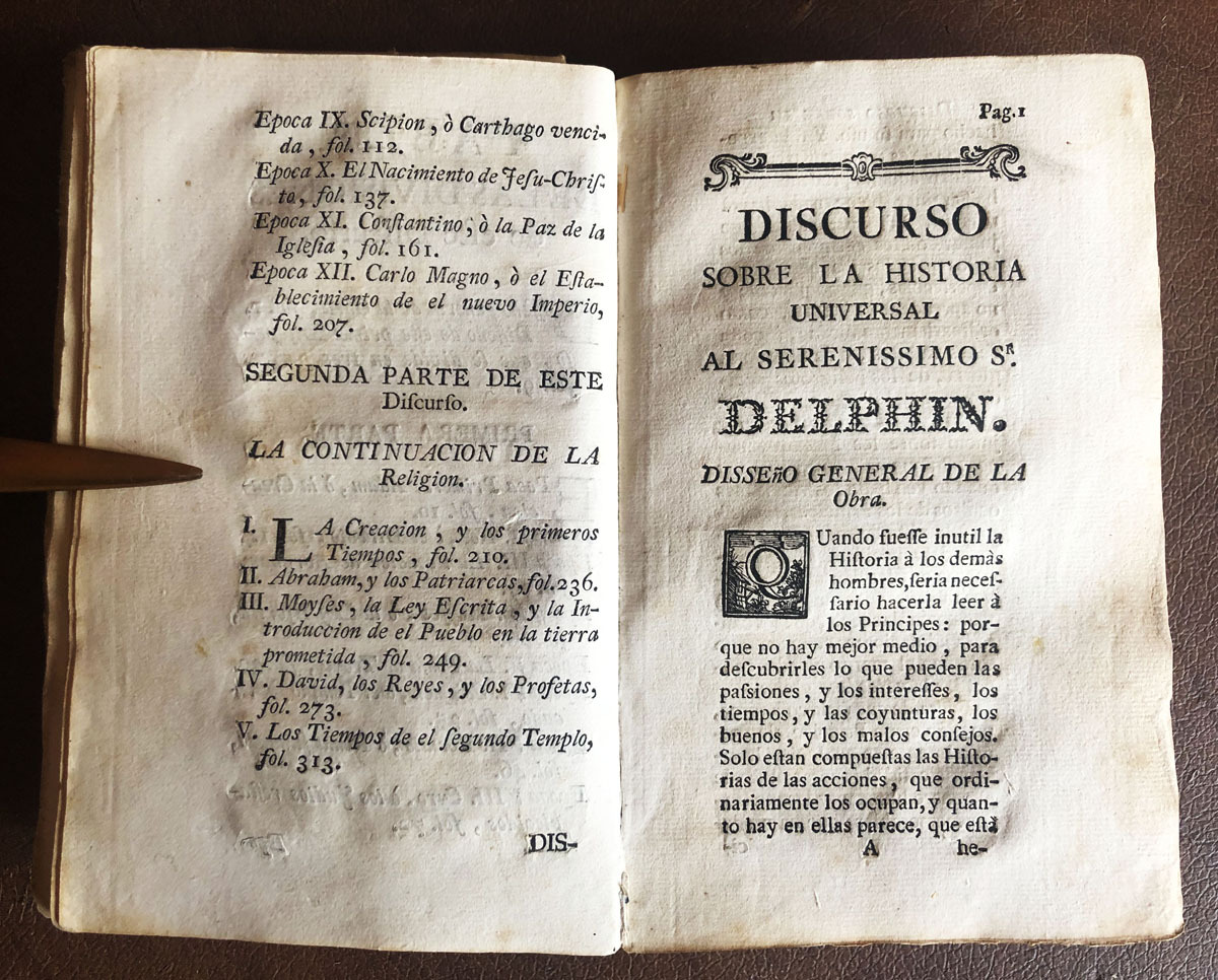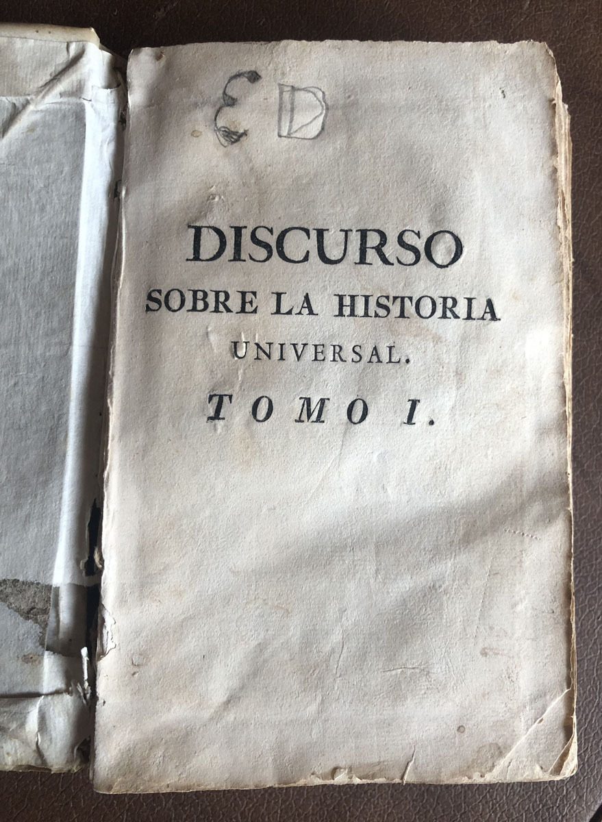 DISCURSO // SOBRE LA HISTORIA // UNIVERSAL, // para explicar la continuacion // de la Religion, y las mudanzas // de los imperios // Primera parte // desde el principio de el mundo // hasta el imperio de Carlo Magno // escrito en la lengua francesa // por el Ilmo. Sr. JACOBO BENIGNO BOSSUET // Obispo de de Meaux, Consejero de el Rey // en sus Conssejos, maestro antes del Serenísimo Señor Delphin, y primer Limosnero de la // Serenissima Señora Delphina // y traducido en idioma español // por ANDRES DE SALCEDO // dedicado // al principe nuestro señor // tomo I. // con licencia del real consejo // en VALENCIA: por BENITO MONFORT año 1772.