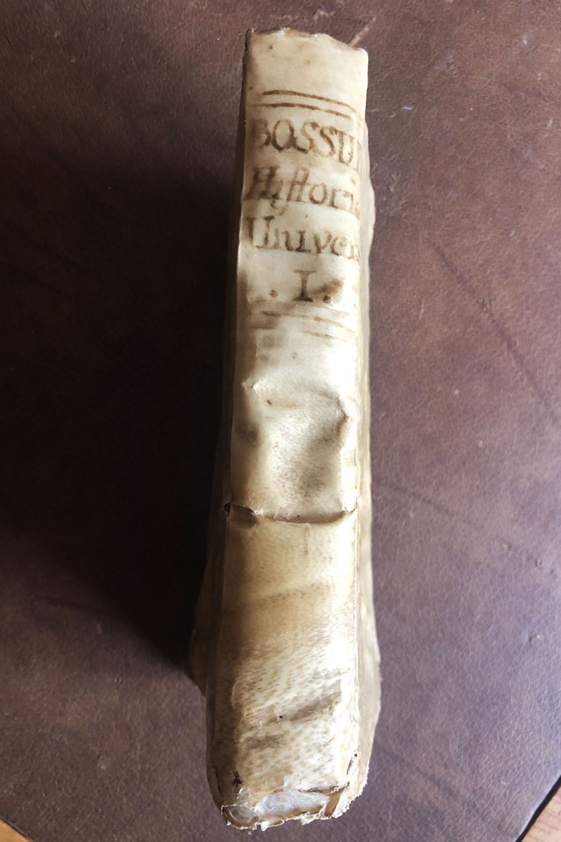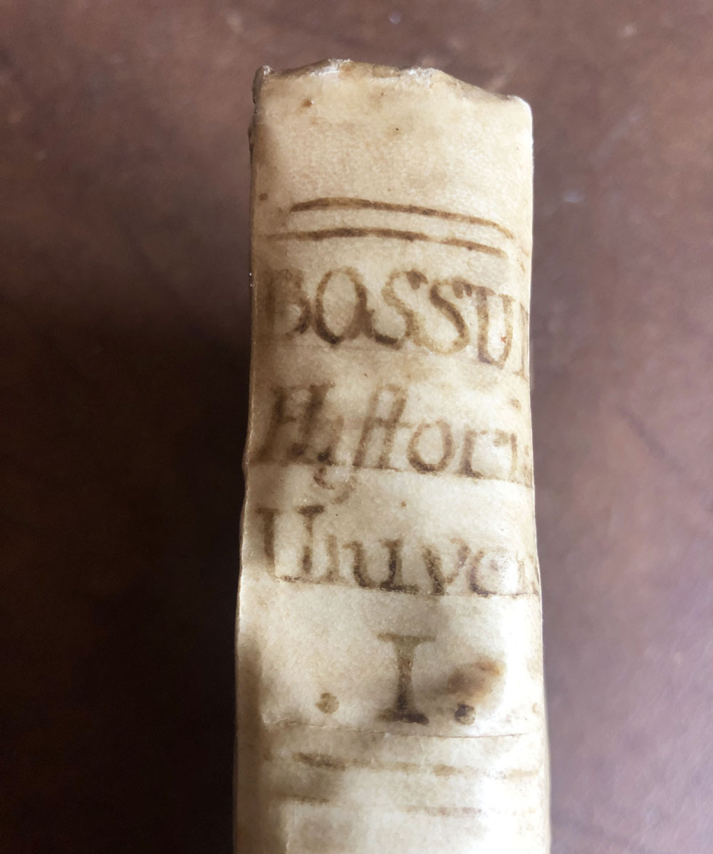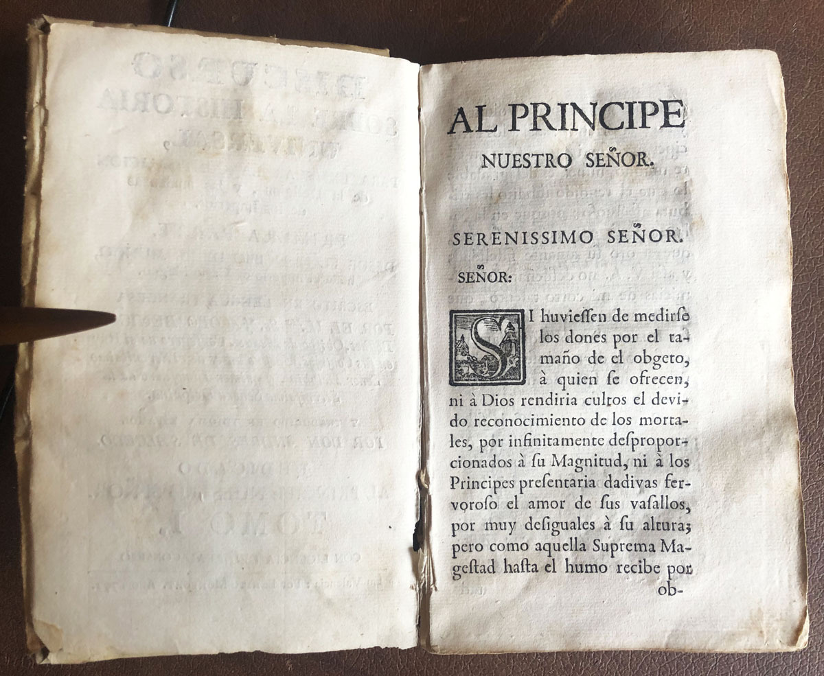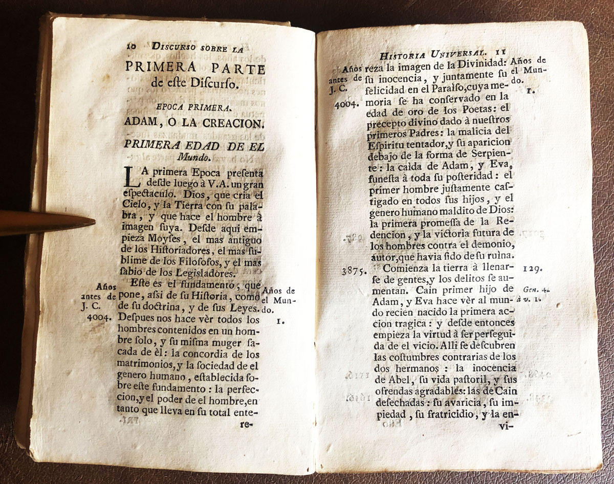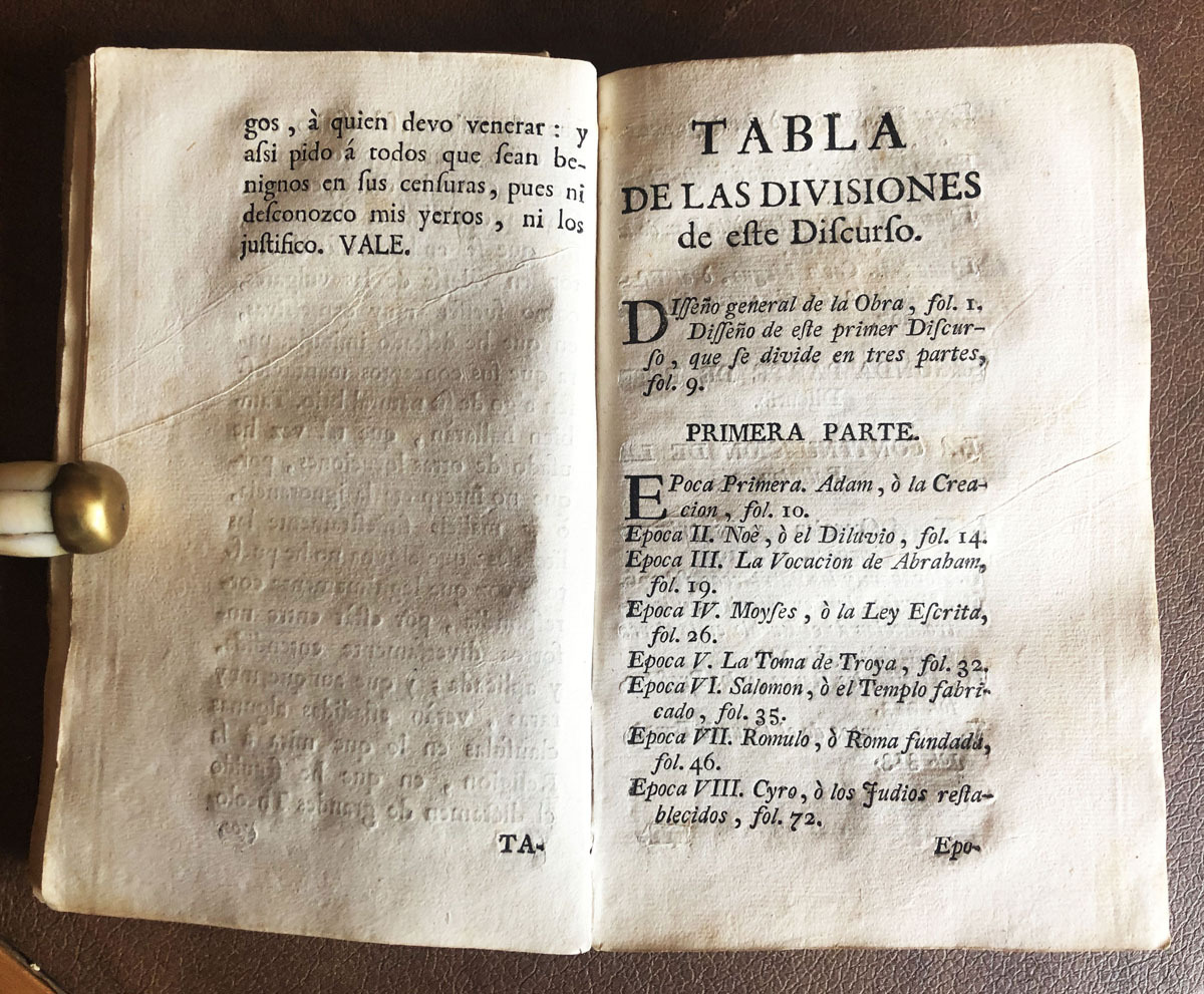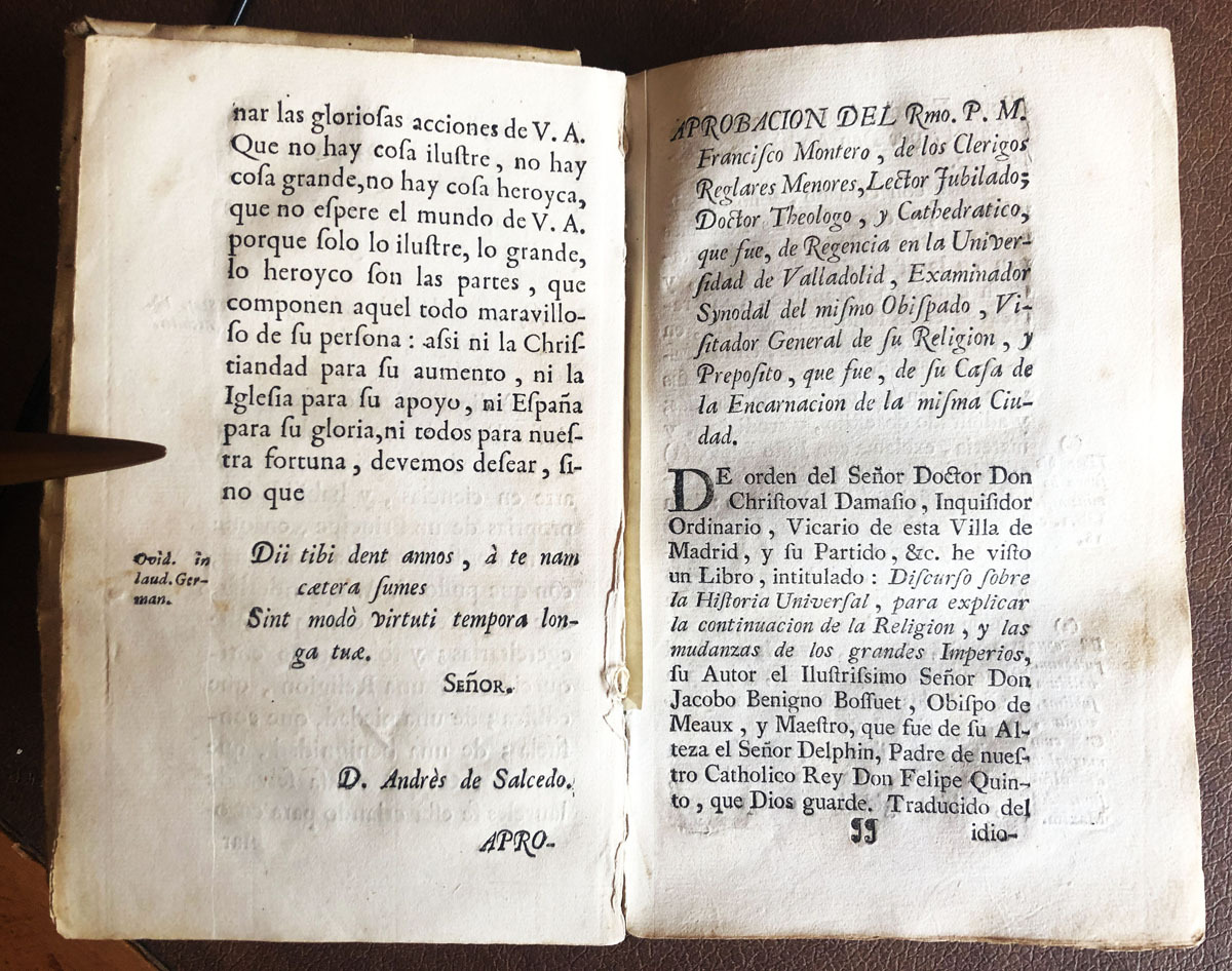 DISCURSO // SOBRE LA HISTORIA // UNIVERSAL, // para explicar la continuacion // de la Religion, y las mudanzas // de los imperios // Primera parte // desde el principio de el mundo // hasta el imperio de Carlo Magno // escrito en la lengua francesa // por el Ilmo. Sr. JACOBO BENIGNO BOSSUET // Obispo de de Meaux, Consejero de el Rey // en sus Conssejos, maestro antes del Serenísimo Señor Delphin, y primer Limosnero de la // Serenissima Señora Delphina // y traducido en idioma español // por ANDRES DE SALCEDO // dedicado // al principe nuestro señor // tomo I. // con licencia del real consejo // en VALENCIA: por BENITO MONFORT año 1772.