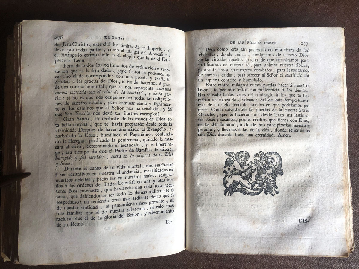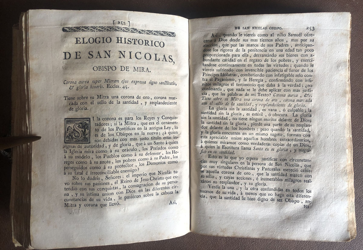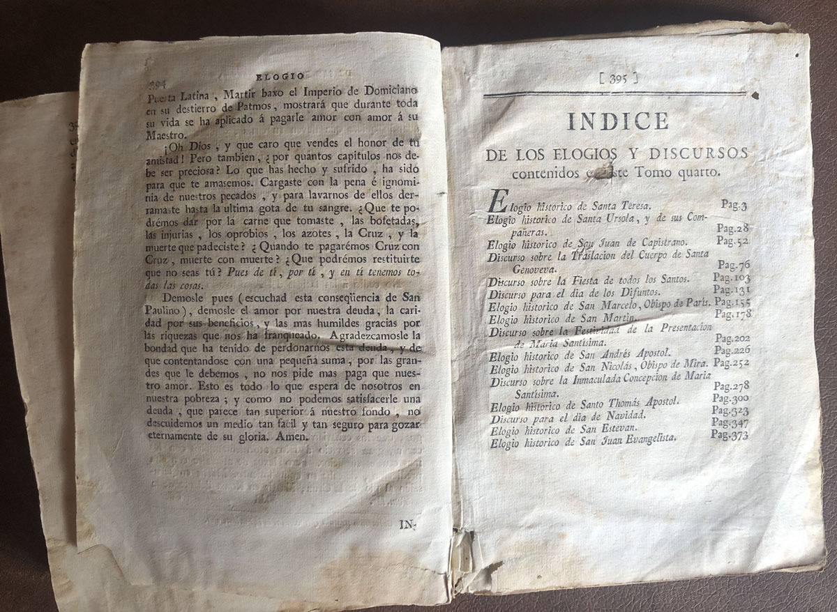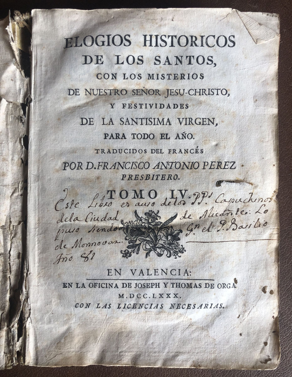 ELOGIOS HISTORICOS // DE LOS SANTOS, // con los misterios // de Nuestro Señor Jesu-Christo, // y festividades // de la Santísima Virgen, // para todo el año. // Traducido del Francés // Por Don Francisco Antonio Pérez // presbitero // Tomo IV // EN VALENCIA // EN LA OFICINA DE JOSEPH Y THOMAS DE ORGA // MDCCLXXX // con las licencias necesarias.
