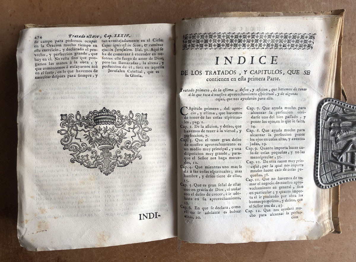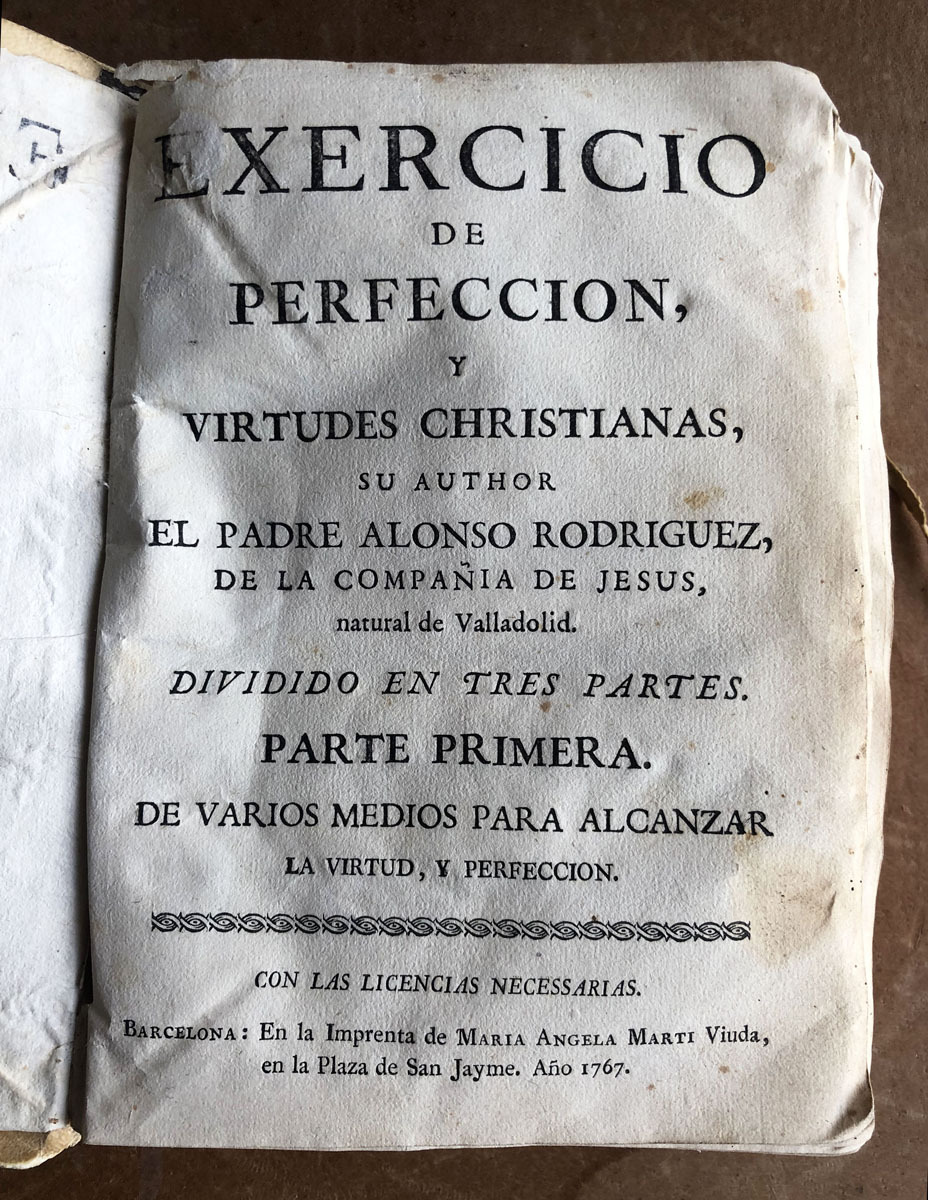 Exercicio // de // Perfeccion, // Virtudes Christianas, // su Author // El Padre Alonso Rodriguez, // de la compañia de Jesús, // natural de Valladolid. // Dividido en tres pares. // Parte Primera,. // de varios medios para alcanzar // la virtud, y perefección. // Con las licencias necessarias. // Barcelona: En la imprenta de Maria Angela Martí Viuda, en la Plaza de San Jayme, Año 1767