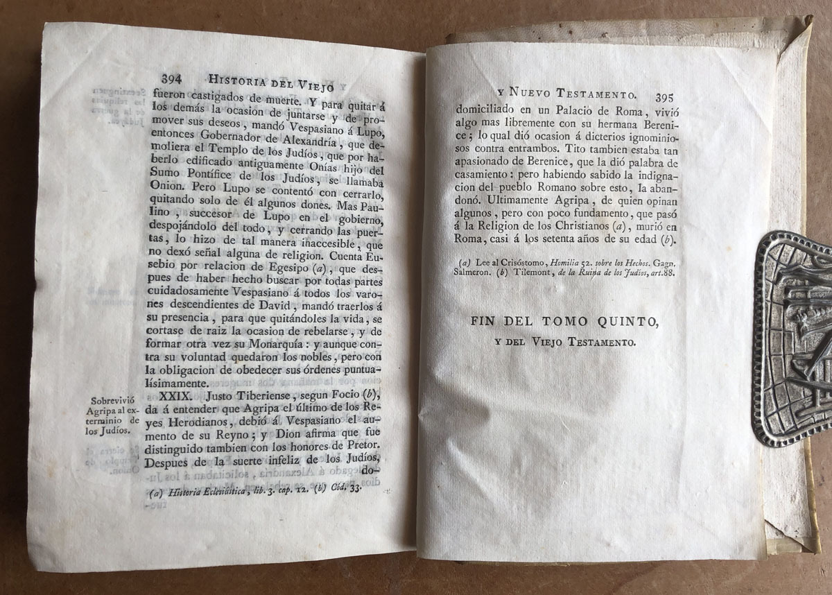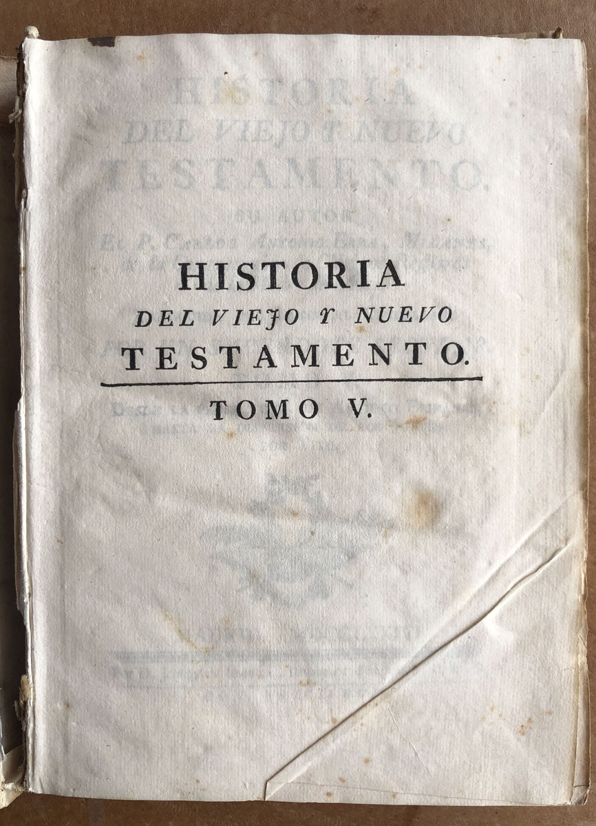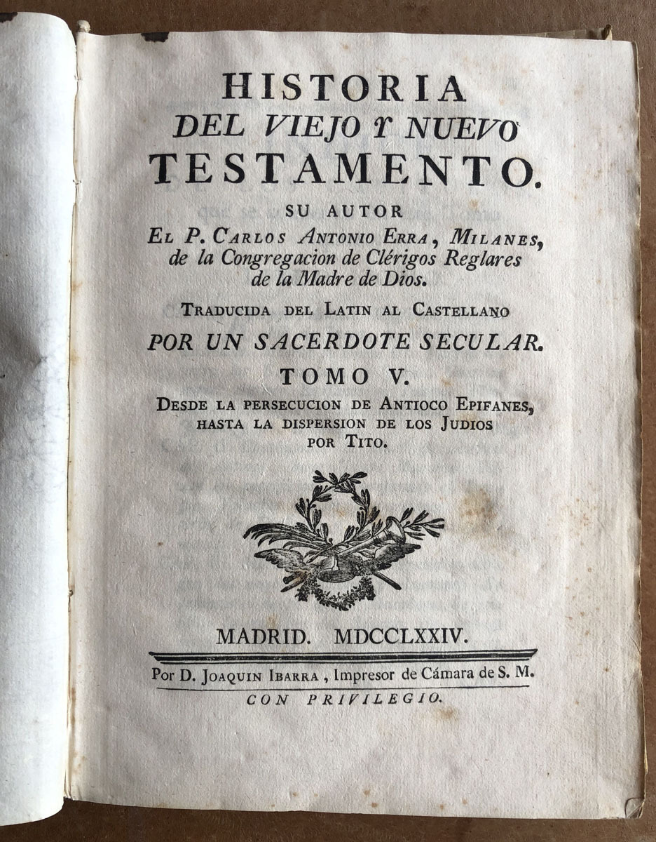 Historia // del Viejo Y nuevo // Testamento. // Su Autor // El P. Carlos Antonio Erra, Milanés, // de la Congregación de Clérigos Reglares // de la Madre de Dios. // Traducida del Latin al Castellano // por un Sacerdote Secular. // Tomo V. // desde la persecucion de Antioco Epifanes hasta la dispersion de los Judios por Tito. // Madrid. MDCCLXXV. // Por D. Joachin Ibarra, Impresor de Cámara de S. M. // Con Privilegio.
