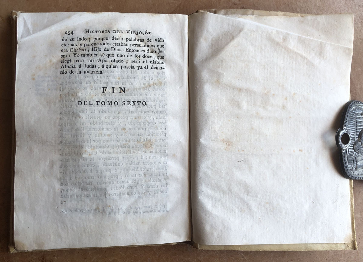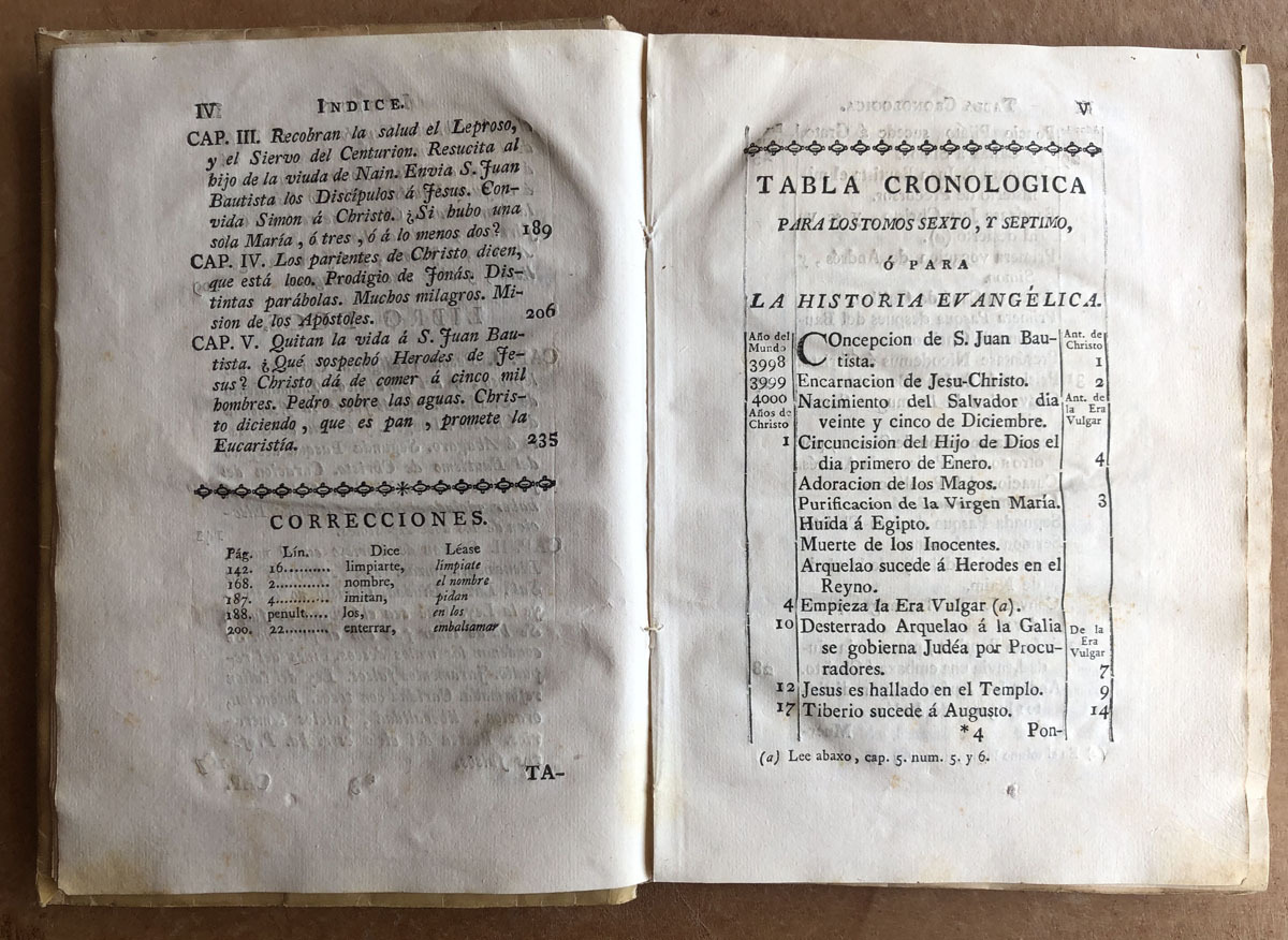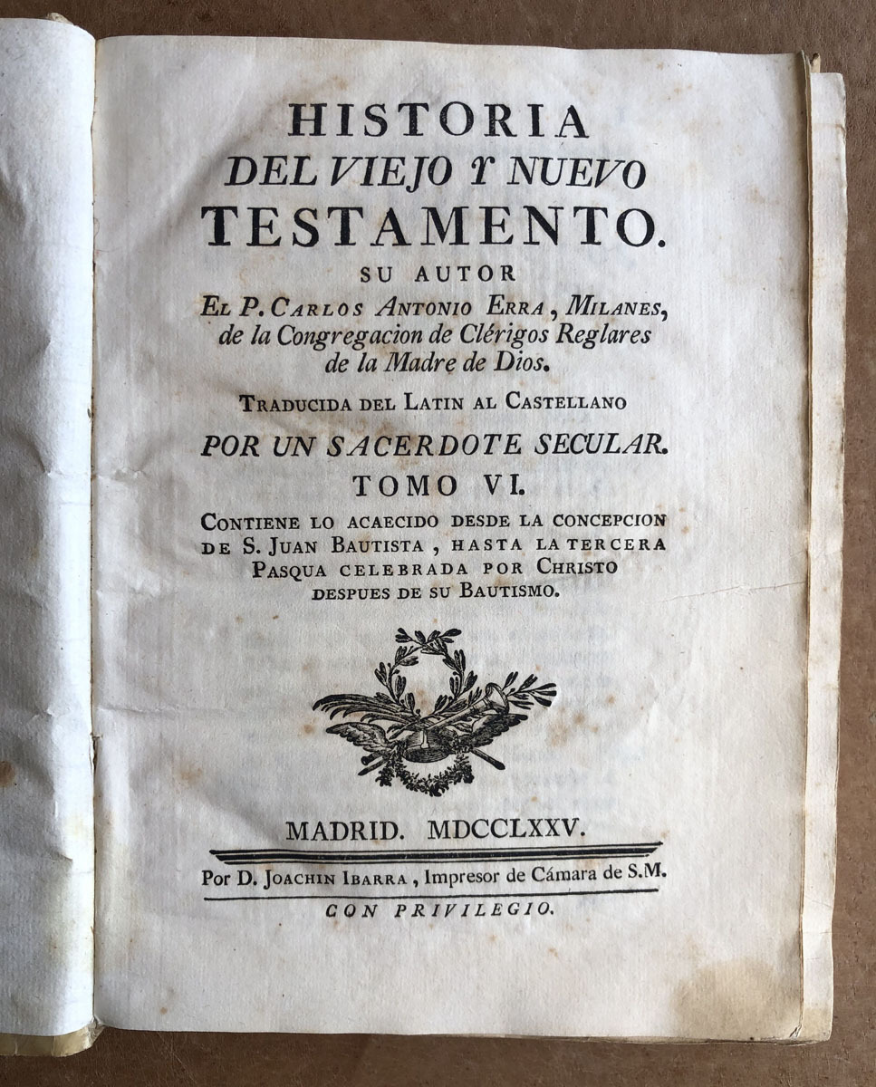 Historia // del Viejo Y nuevo // Testamento. // Su Autor // El P. Carlos Antonio Erra, Milanés, // de la Congregación de Clérigos Reglares // de la Madre de Dios. // Traducida del Latin al Castellano // por un Sacerdote Secular. // Tomo VI. // Contiene lo acaecido desde la concepcion // de S. Juan Bautista, hasta la tercera // Pasqua Celebrada por Christo // despues de su bautismo // Madrid. MDCCLXXV. // Por D. Joachin Ibarra, Impresor de Cámara de S. M. // Con Privilegio.