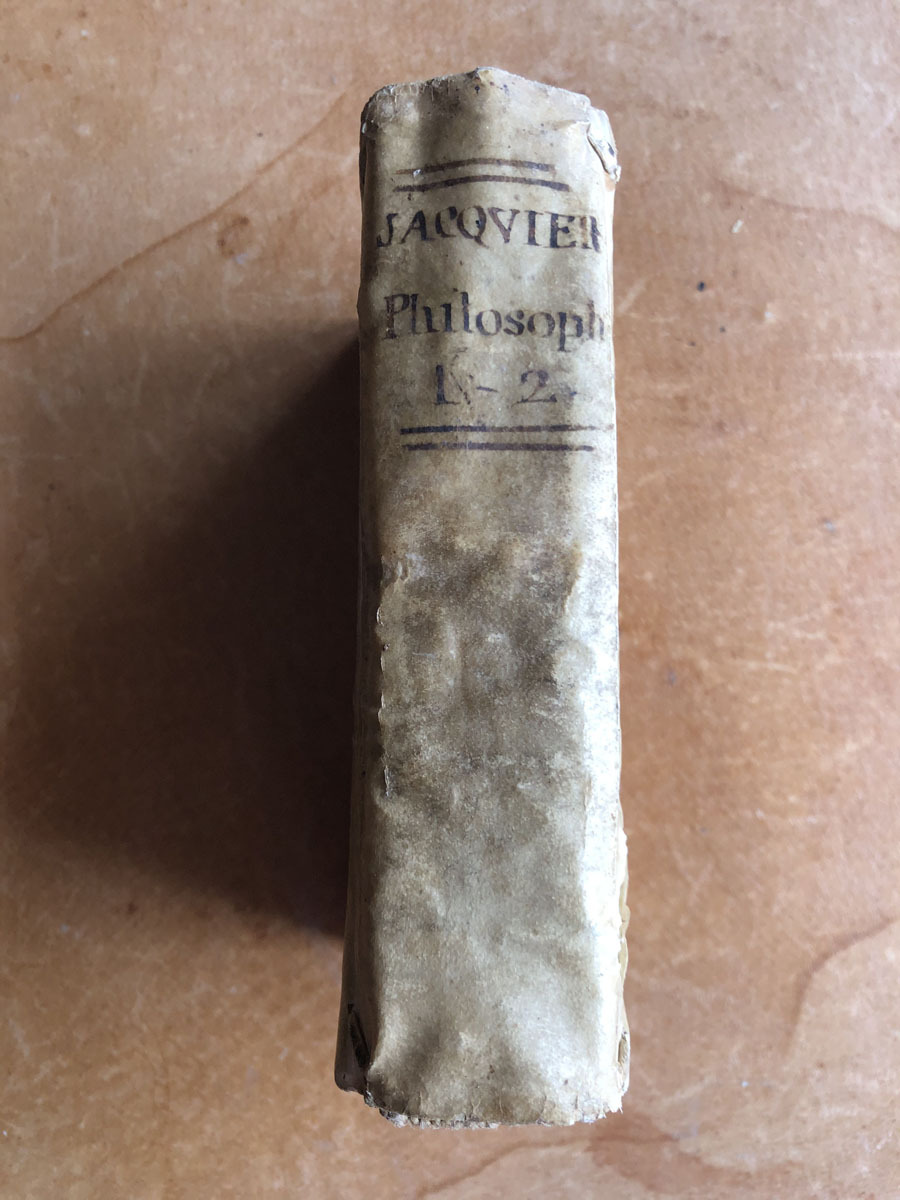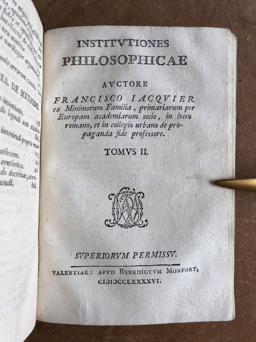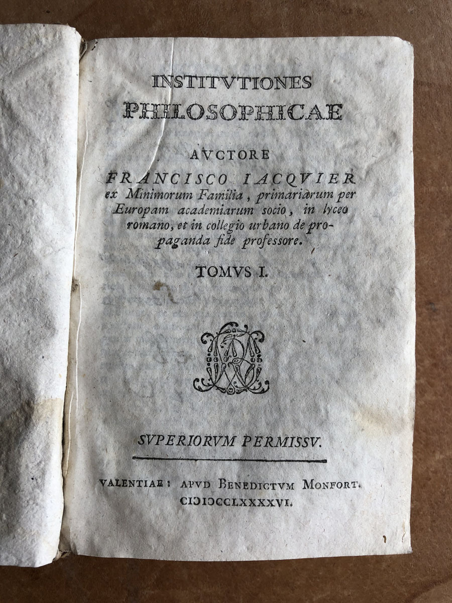 Intitutiones // Philosophicae // Auctore // Francisco Iacqvier // ex Minimorum Familia, Primariarum per // Europam academiarum socio, in lyceo // romano, et in collegio urbano de pro- // paganda fide professore. // Tomus I. // Superiorumm Permissu // Valentiae: Apud Benedictum Monfort. // CI)I)CCLXXXXVI [1794]