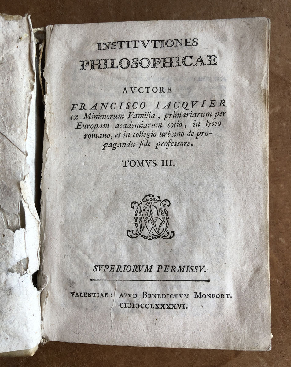 Intitutiones // Philosophicae // Auctore // Francisco Iacqvier // ex Minimorum Familia, Primariarum per // Europam academiarum socio, in lyceo // romano, et in collegio urbano de pro- // paganda fide professore. // Tomus III. // Superiorumm Permissu // Valentiae: Apud Benedictum Monfort. // CI)I)CCLXXXXVI (1796)