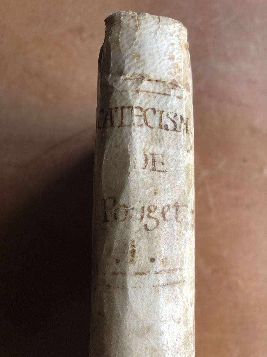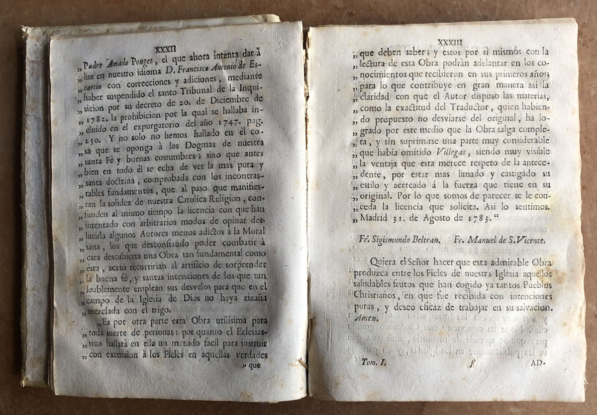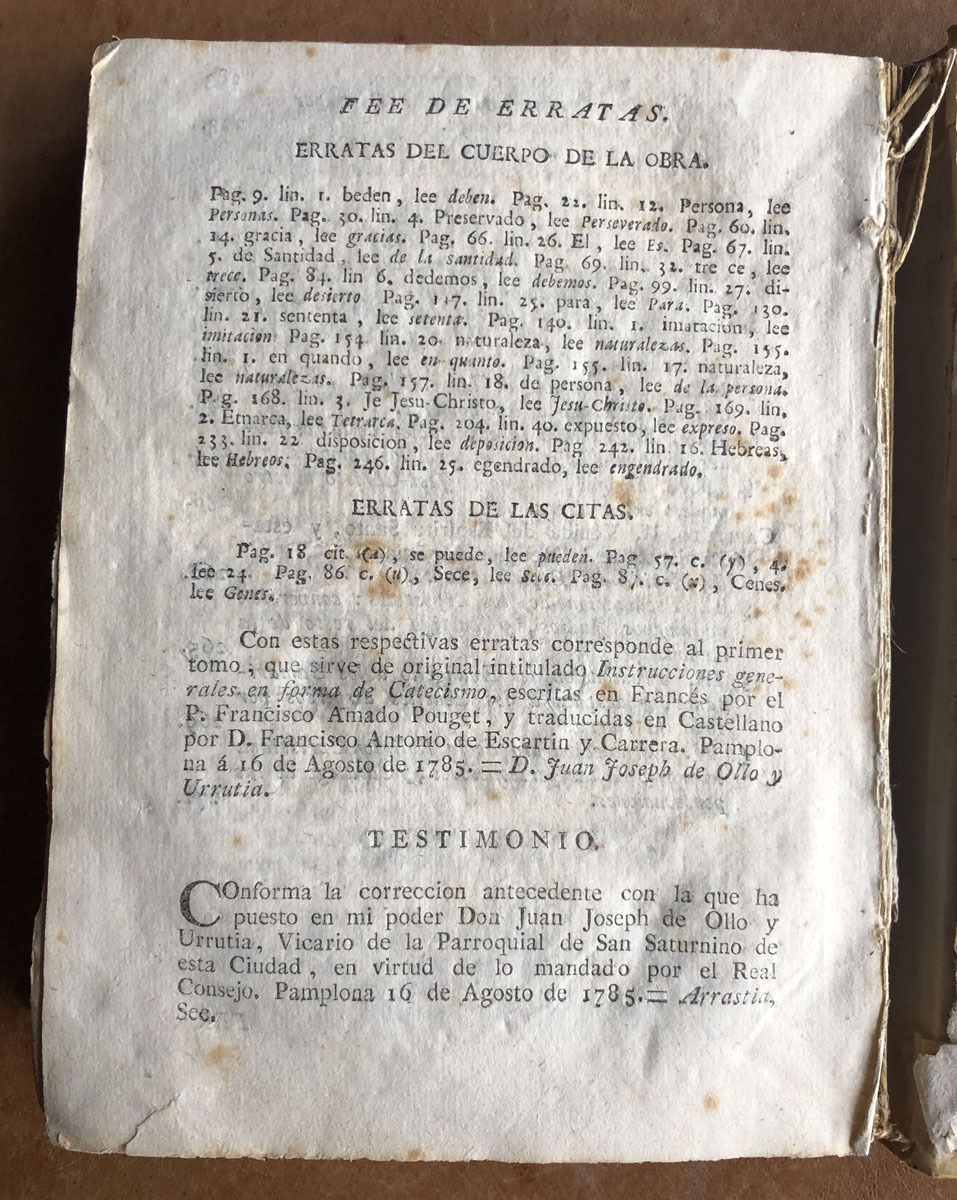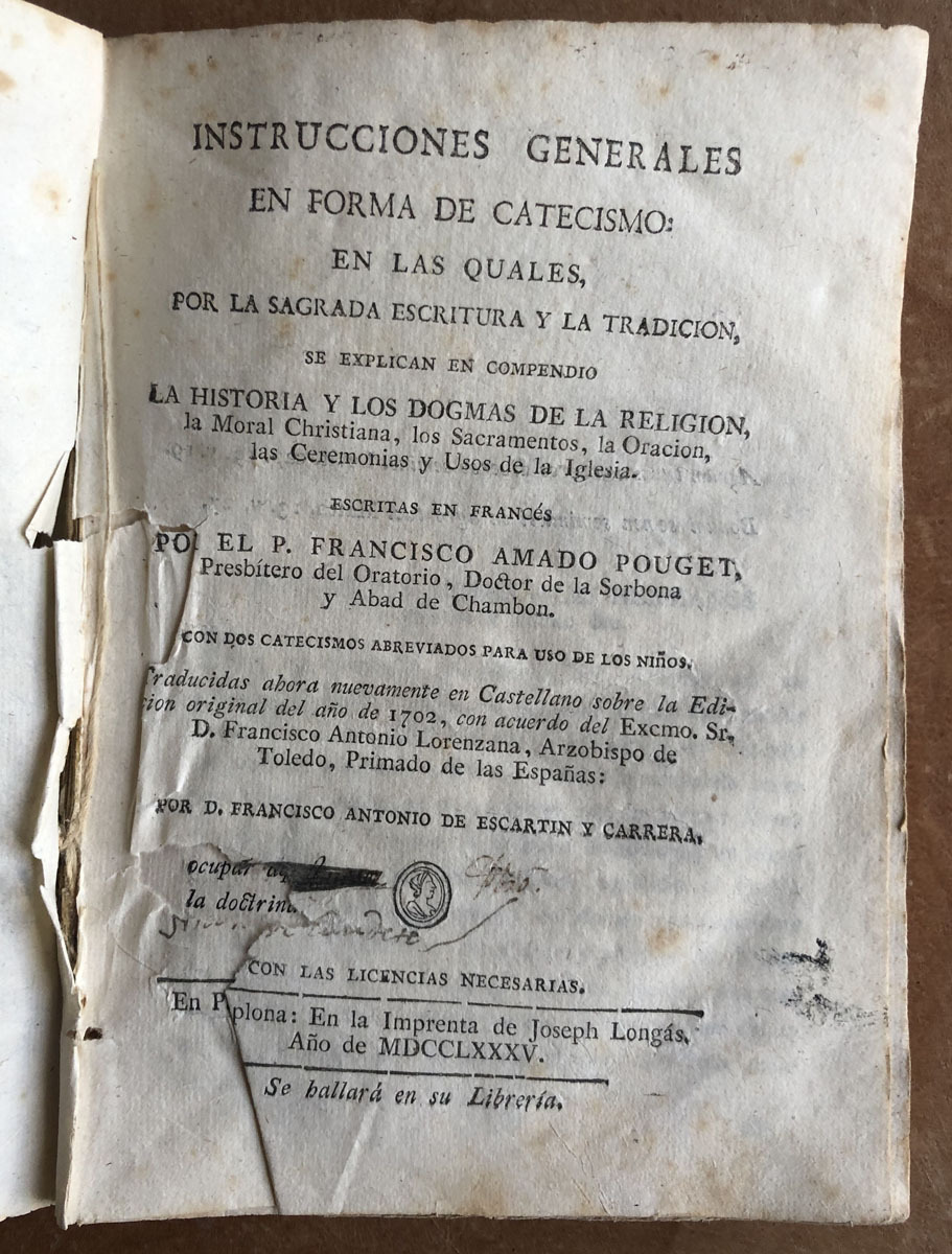 Instrucciones generales // en forma de catecismo: // en las quales, // por la sagrada escritura y la tradicion, // se explican en compendio // La historia y los dogmas de la religion, // la Moral Christiana, los Sacramentos, la Oracion, Las ceremonias y Usos de la Iglesia. // Escritas en Francés // Por el P. Francisco Amado Pouget, // Presbitero del Oratorio, Doctor de la Sorbona y Abad de Cahmbon. // Con dos catecismos abreviados para uso de los niños. // Traducidas ahora nuevamente en Castellano sobre la Edi- // cion original del año de 1702, con acuerdo del Excmo. Sr. // D. Francisco Antonio Lorenzana, Arzobispo de // Toledo, Primado de España: // Por Francisco Antonio de Escartin y Carrera. // Con las licencias necesarias. // en Pamplona: En la Imprenta de Joseph Longás, // Año de MDCCLXXXV. // Se hallará en su liberia.