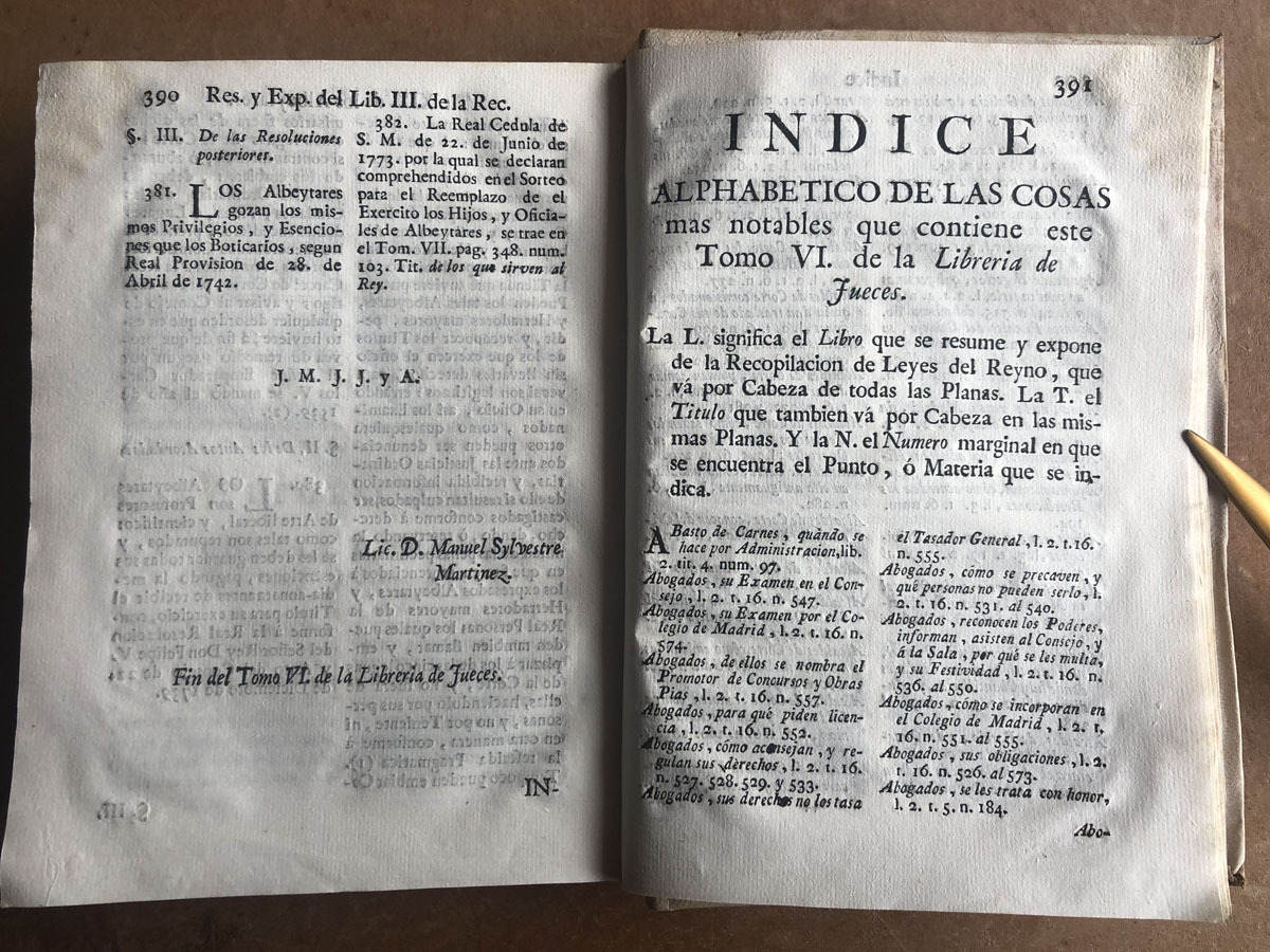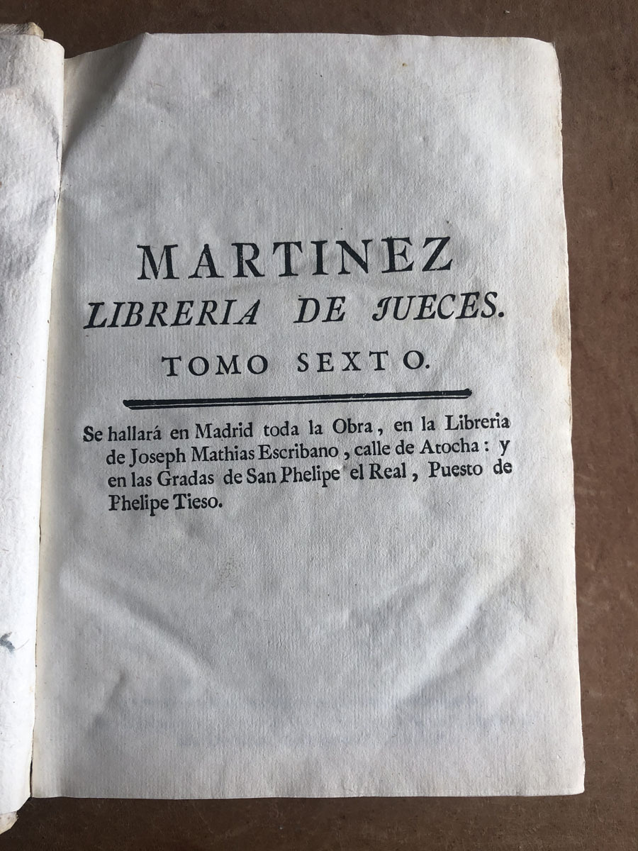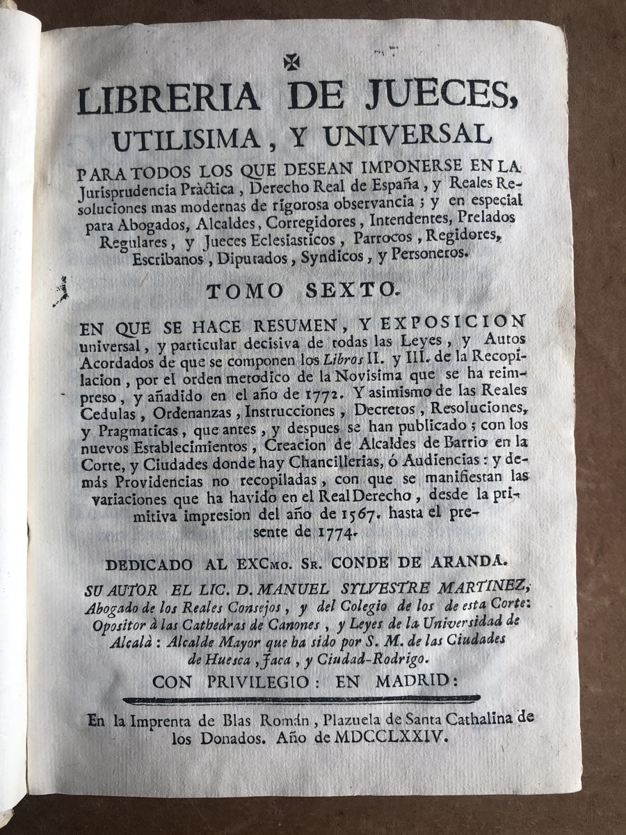 Libreria de Jueces, // Utilisima y Universal // que para todos los que desean imponerse en la // Jurisprudencia Practica, Derecho Real de España, y Reales Re- // soluciones mas modernas de rigorosa observancia, y en especial // para Abogados, alcaldes, Corregidores, Intendentes, Prelados, // Regulares, y Jueces Eclesiasticos, Párrocos, Regidores, // Escribanos, Diputados, Syndicos y Personeros, // Tomo Sexto // … // Dedicado al excm. Sr. Code de Aranda. Su autor el Lic. D. Manuel Silvestre Martinez. // Abogado de los Reales Consejos, y del Colegio de los de esta Cortes: // Opositor à las Cathedras de Canones, y Leyes de la Universidad de // Alcalá: Alcalde Mayor que ha sido de S. M. de las ciudades // de Huesca, Jaca y Ciudad Rodrigo. Con Privilegio : En Madrid: // En la Imprenta de Blas Roman, Plazuela de Santa Cathalina de // los Donados. Año MDCCLXXIV