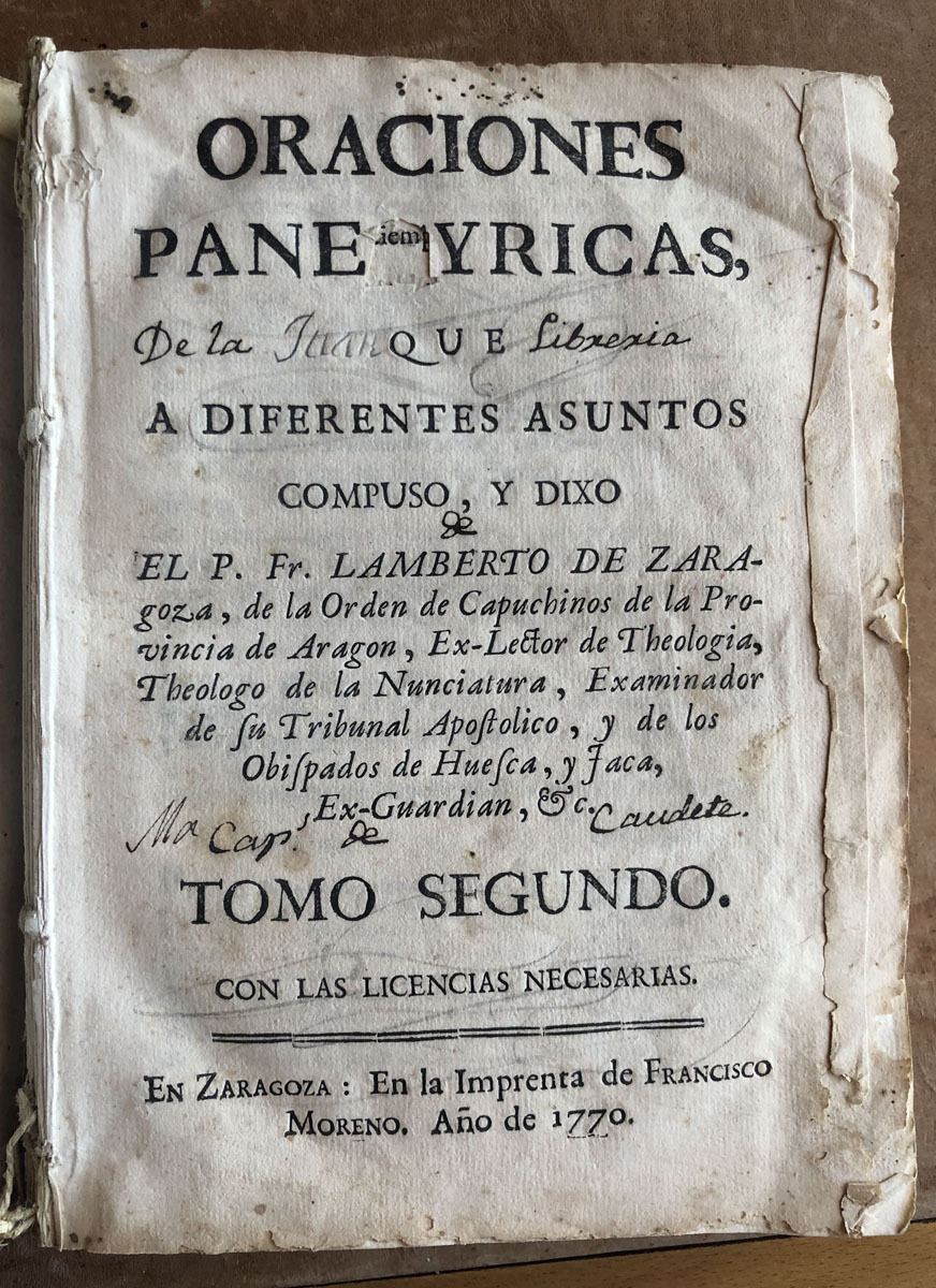 Oraciones // Panegyricas, // que // a diferentes asuntos // compuso, y dixo // El P. Fr. Lamberto de Zara- // goza, de la Orden de Capuchinos de la Provincia de Aragón, Ex- Lector de Thologia, // Theologo de la Nunciatura, Examinador // de su Tribunall Apostolico, y de los // Obispados de Huesca, y Jaca, // Ex-Guardian // Tomo Segundo. // con las licencias necesarias. // En Zaragoza: En la Imprenta de Francisco // Moreno. año de 1770.
