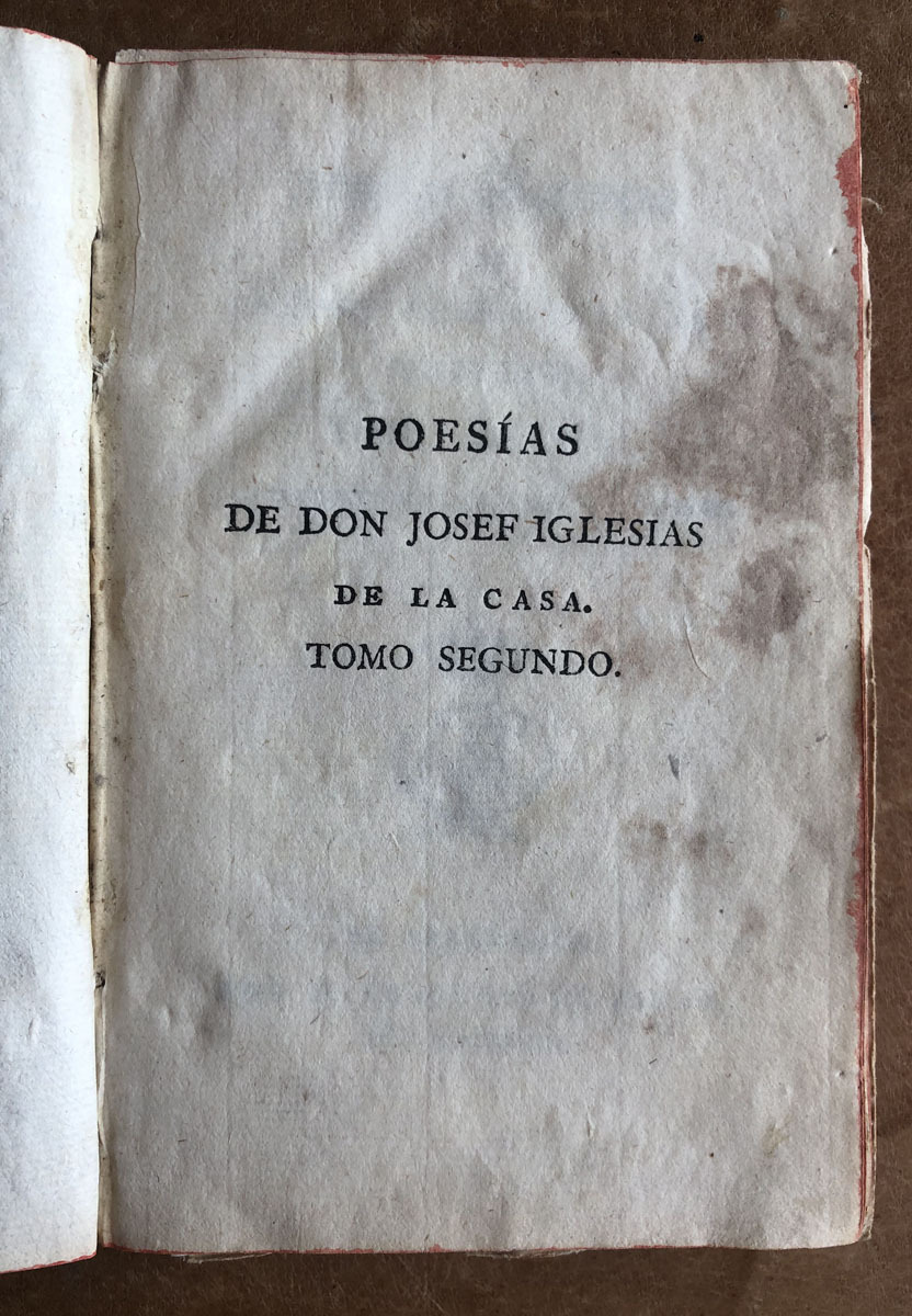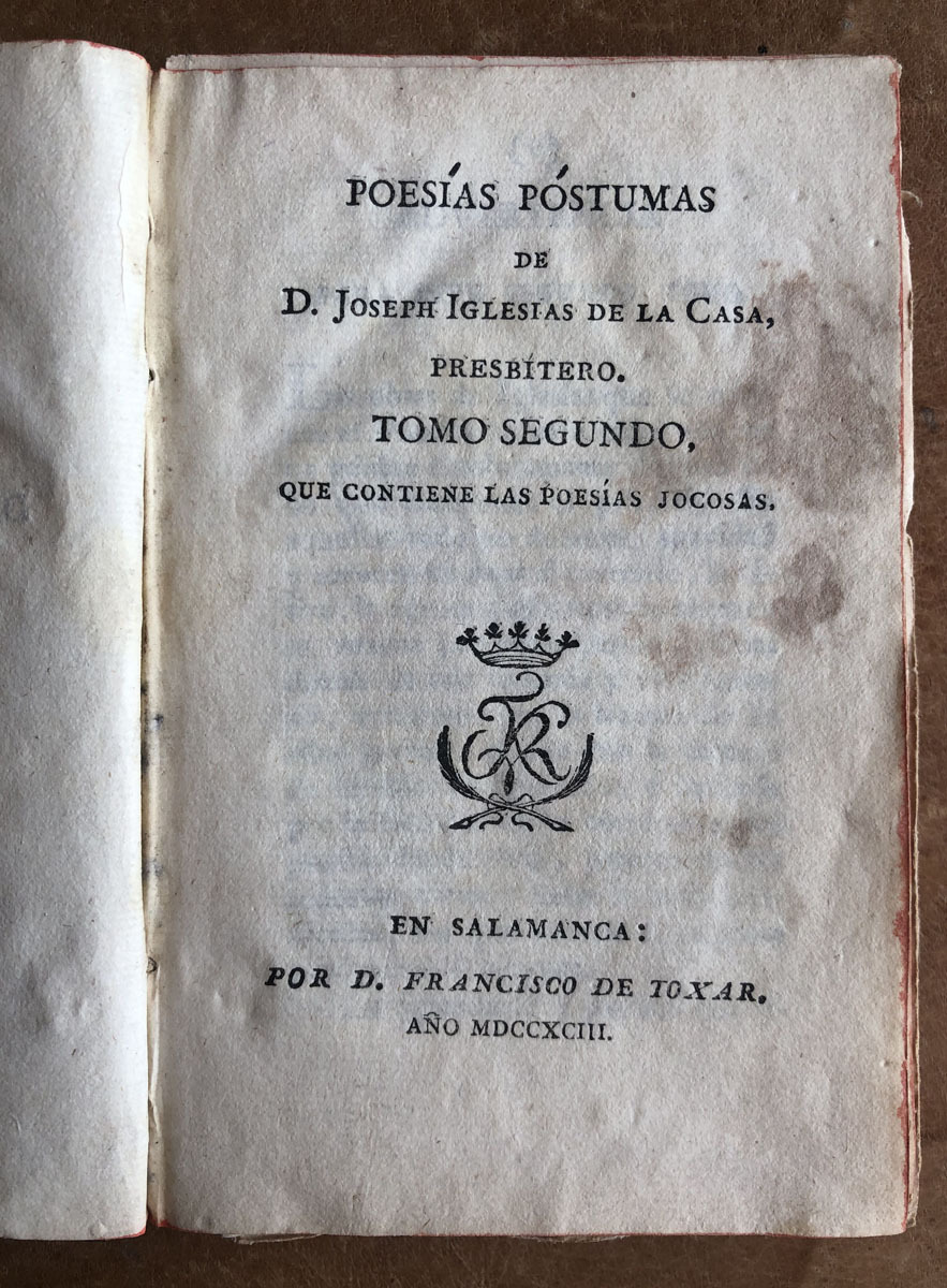 Poesías Póstumas // de // D. Jospeh Iglesias de la Casa, // Presbítero, // Tomo Segundo, // que contiene las poesías jocosas. // En Salamanca: // Por D. Francisco de Toxar. // Año MDCCXCII.