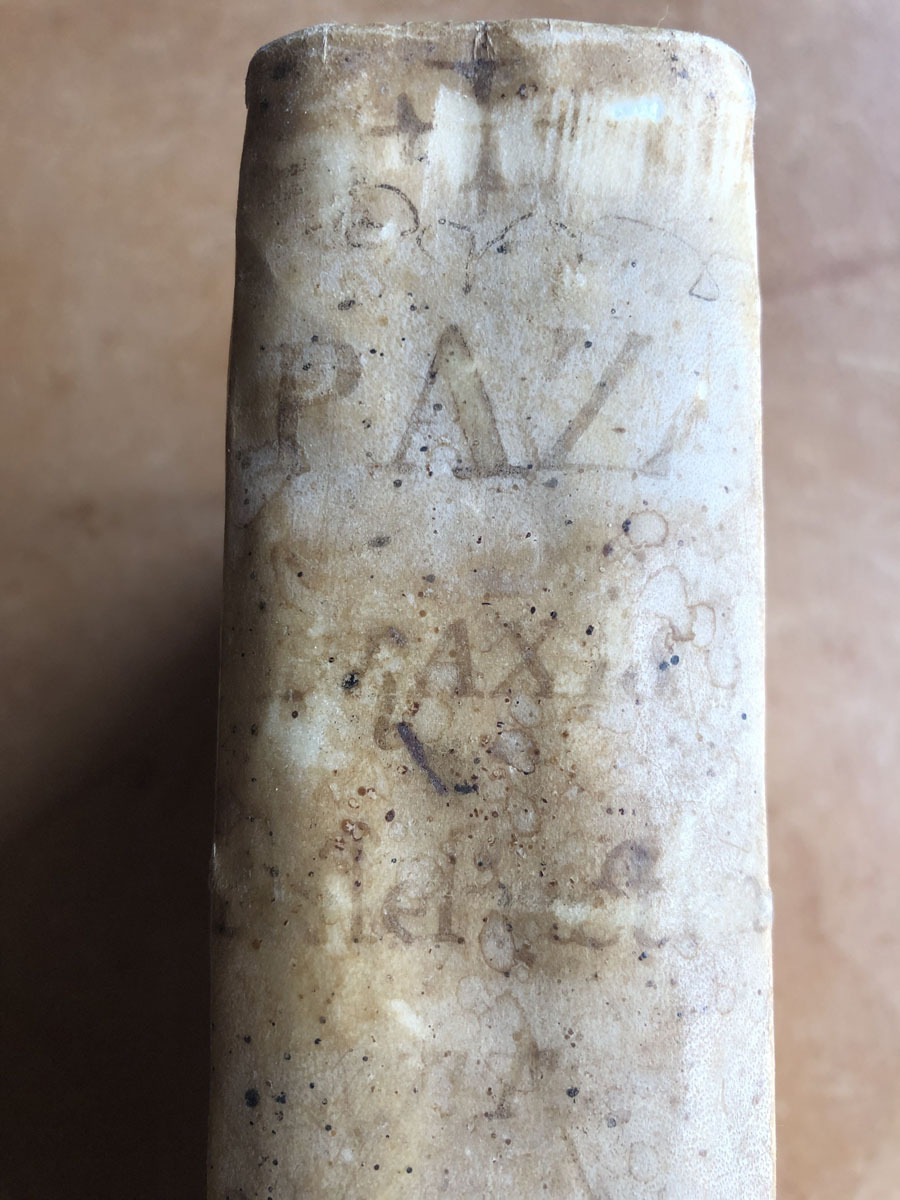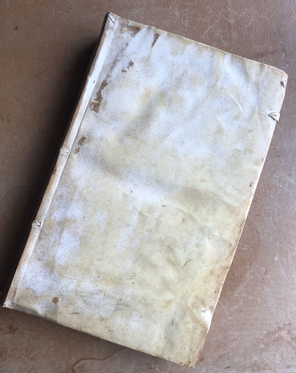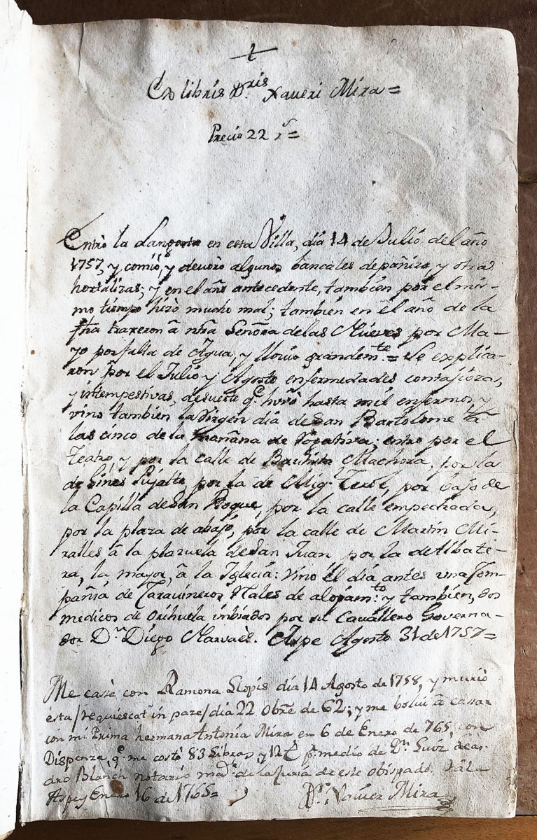 36×23 pergamí 500pag. En la primera guarda apareix una inscripció manuscrita que ompli tota una plana: » + Ex libris Doctoris Xavier Mira= Precio 22 reales= Entro la langosta en esta villa, dia 14 de Julio del año 1757, y comio, y devoro algunos bancales de pañiza y otras hortalizas, y en el año antecedente, tambien por el mismo tiempo hizo mucho mal; tambien el año de la fecha baxeron a ntra Señora de las Nieves por Mayo por falta de agua, y llovio grandemente. Se explicaron por el Julio y Agosto enfermedades contagiosas y intenpestivas, desuerte que huvo hasta mil enfermos y vino tambien la Virgen dia de San Bartolome a las cinco de la mañana de rogativas; entro por el teatro, y por la calle de Bautista Machoza, por la de Gines Pujalte, por la de Miguel Terol,  por bajo de la Capilla de San Roque, por la calle empedrada, por la plaza de abajo, por la calle de Martin Miralles a la Plazuela de San Juan, por la de Albatera, la mayor, a la Yglesia: vino el dia antes una compañia de Caravineros, Reales de alojamiento y tambien dos medicos de orihuela imbiados por el Caballero Governador D. Diego Narvaez. Aspe Agosto 31 de 1757= Me case con Ramona Llopis dia 14 Agosto de 1758, y murio esta /requiescat in pace/ dia 22 octubre 62; y me bolvi a casar com mi Prima hermana Antonia Mira en 6 de Enero de 1765, con dispensa, que me costo 83 libras, y 12 sueldos por medio de D. Luis Leandro Blanch notario apostolico de la curia de ese obispado. Vale Aspe Enero 16 de 1765 . Dr. Xavier Mira (signat) Portada: Ex Libris D. Francisco Xavier Mira.