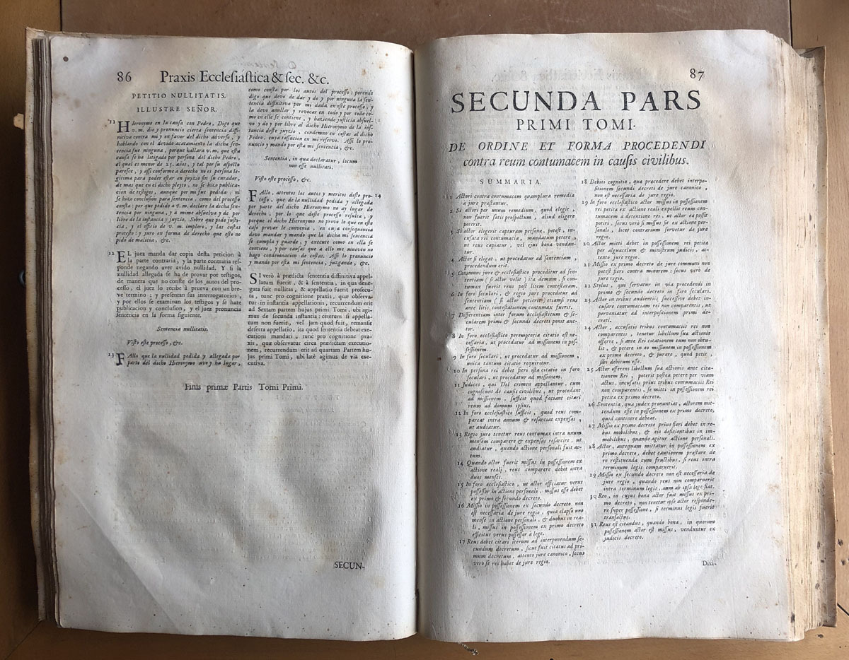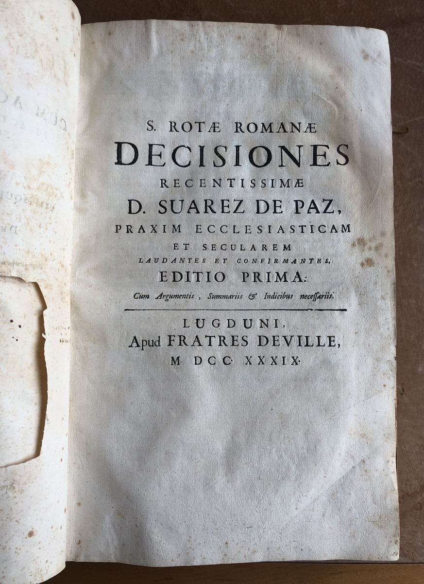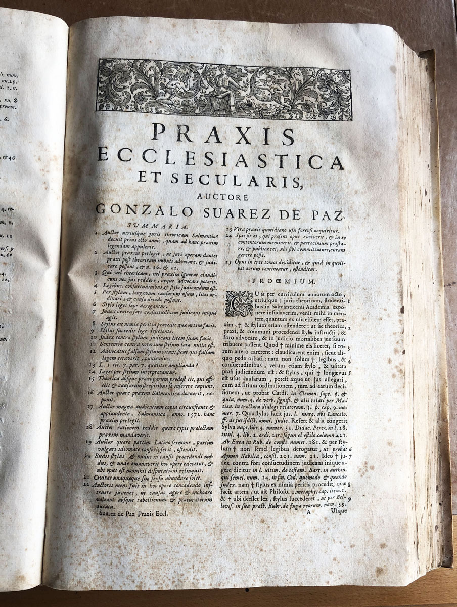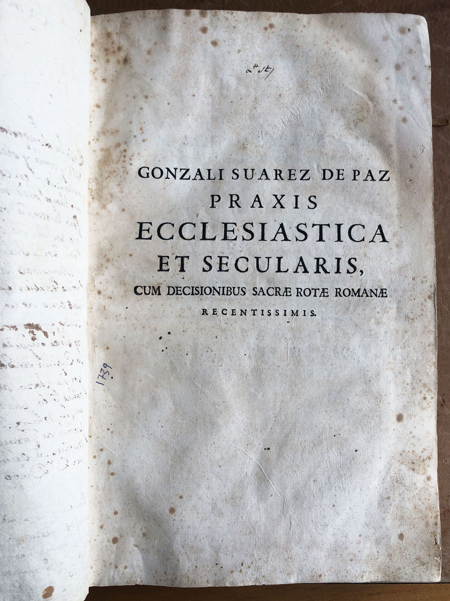 Praxis // ecclesiastica // et secularis // cum Actionum fomulis // etc actis processuum hispano // sermone compositis; // auctore // Gonzalo Suarez de Paz // utrisque juris doctorae celeberrimo // cui accessere sacre rotae romanae // decisiones recentissimae // cum inidice materiarum, livellorum, petitionum, // interrogatorium, sententiarum, aliorumque, Actuum judicialium: nec // non locorum ex jure Civili, Pontificio & regio explicatorum // Lugduni // apud Frates Deville // M. DCC, XXXIX