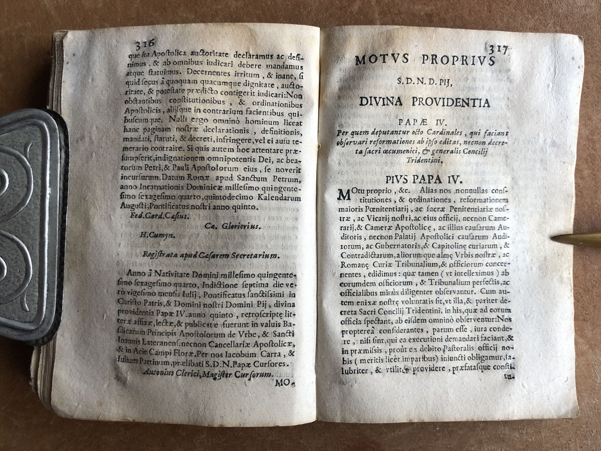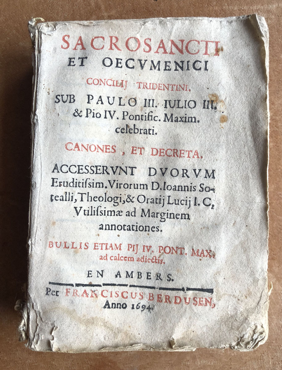 Sacrosancti // et Oecumeneci // Concilii Tridentini. // Sub Paulo III Iulio III.// & Pio IV Pontific. Maxim. // celebrati. Canones, et Decreta. // Accesserunt Duorum // Eruditisim, Virorum. D. Ioanis So- // tealli. Theologi, & Oratii Lucii I. C, // Utilissimae ad Marginem // annotationes. // Bullins Etiam Pii IV Pont. Max. // ad calcem adiectis. // en Ambers // Per Franciscus Berdusen. // Anno 1694