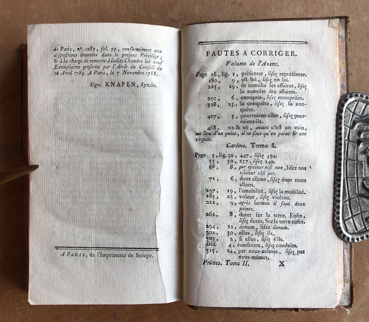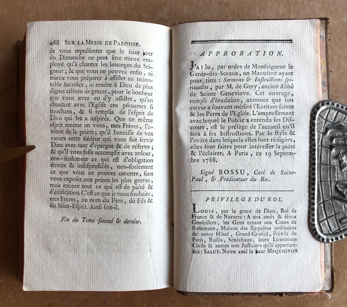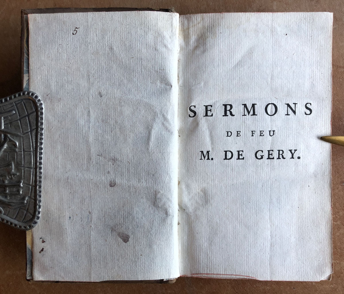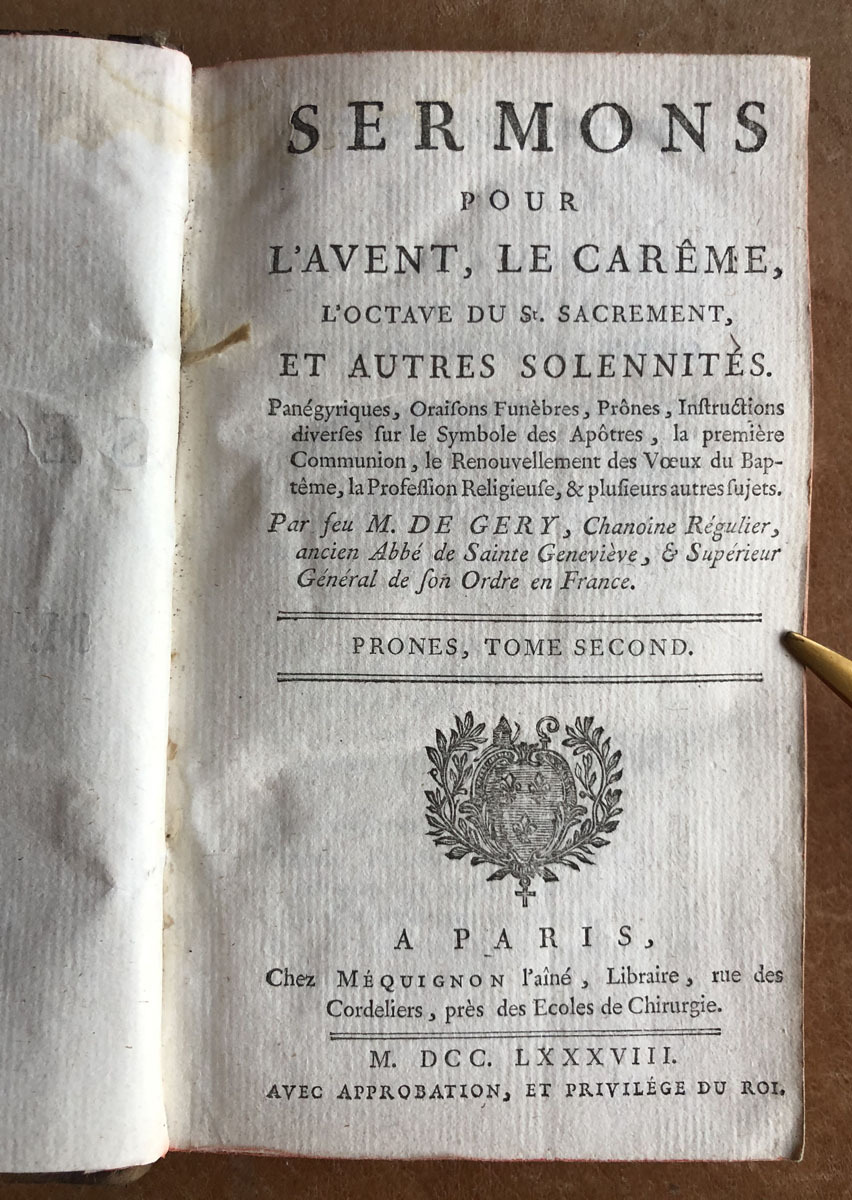 Sermons // pour // L’avent, le caréme, l’octave du St. Sacrament, // et autres solenniteés // … // Par feu M. De Gery, Chanoine Régulier, // ancien Abbé de Sainte Geneviève, & Supériur // General de son Ordre en France // Prones, Tome Second. // A Paris, // Chez Mequigon làiné, Libraire, rue des // Cordeleiers, prés des Ecoles de Chirurgie, // M.DCC. LXXXVIII.