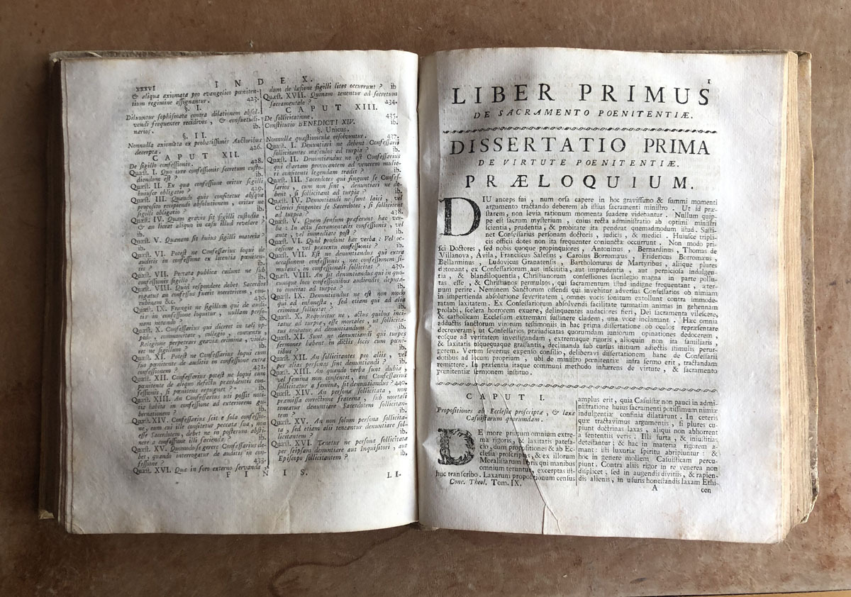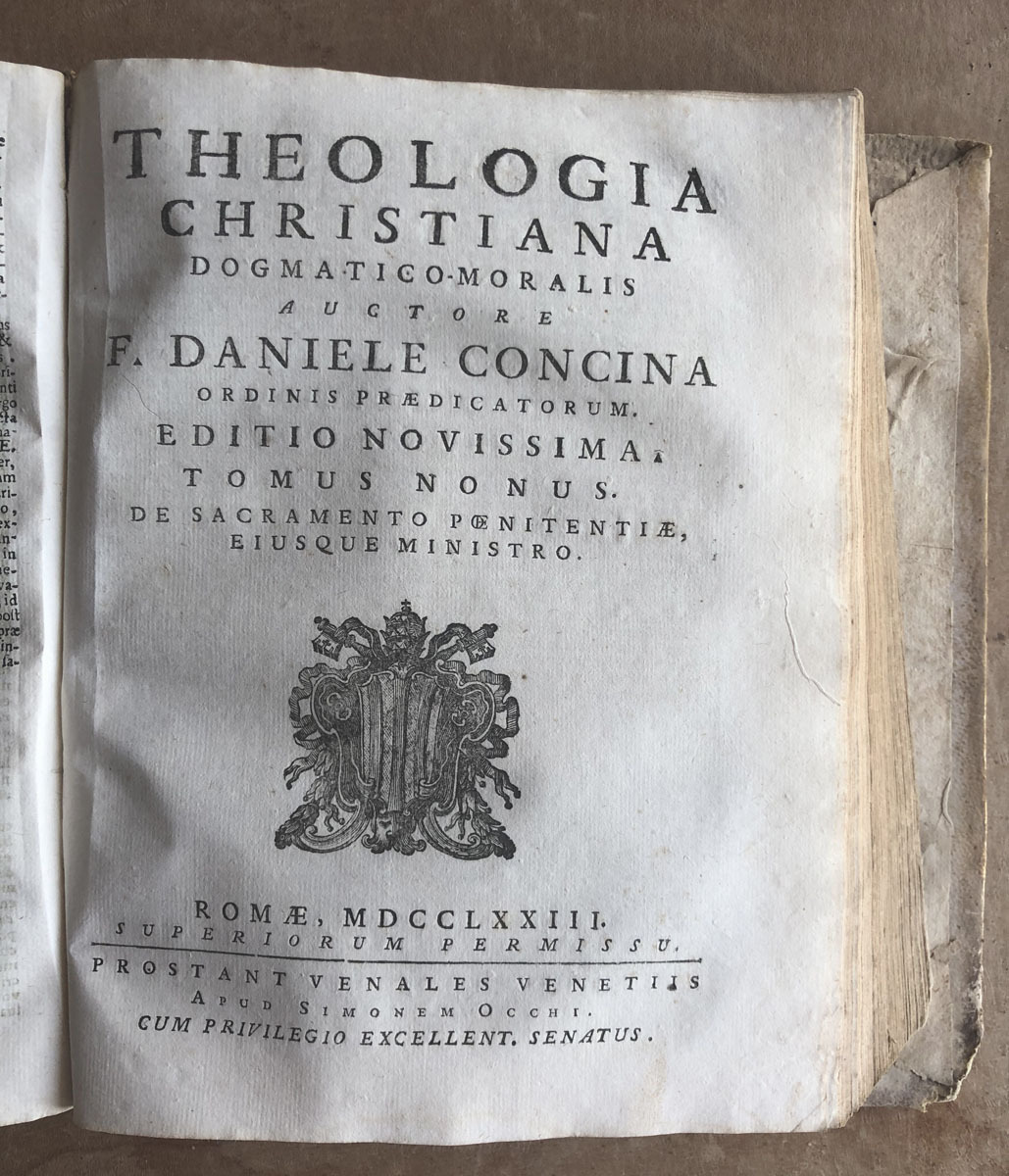Theologia // Cristiana // Dogmatico-Moralis // Auctore // F. Daniele Concina // Ordinis Preadicatorum // Editio Novissima // Tomus Nonus. // De Sacramento Poenitentiae, // Eiusque Ministro // Rome, MDCCLXXIII. // Superiorum permis. // Prostant venales Venetiis // Apud Simonen Occhi. // Cum Privilegio Excellent. Senatus.