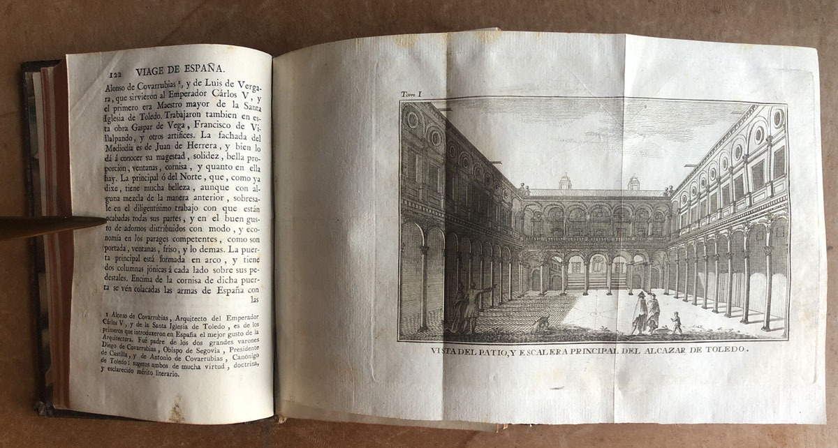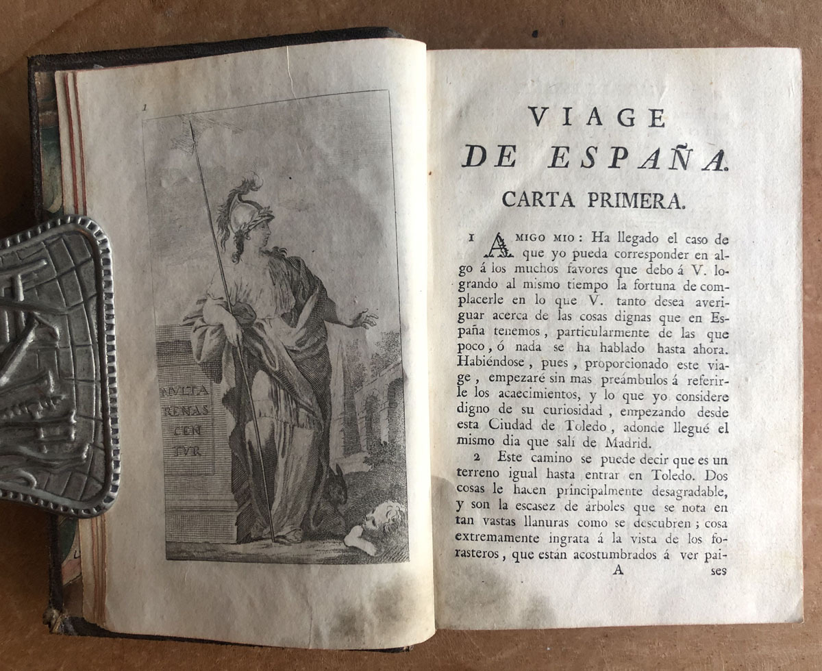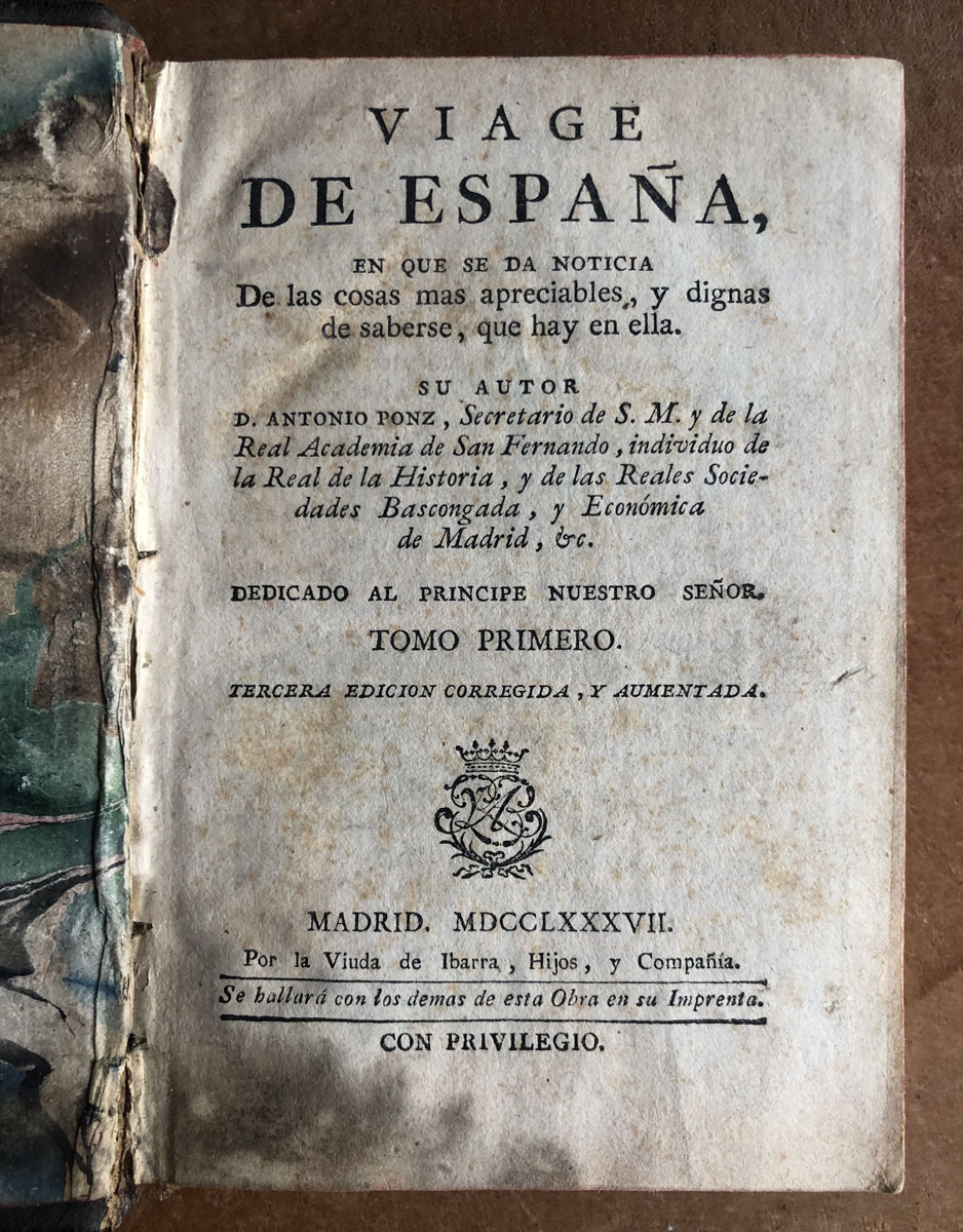 Viage // De España // en que se da noticia // De las cosas mas apreciables, y dignas // de saberse, que hay en ella. // Su autor // D. Antonio Ponz, Secretario de S. M. y de la REal Academia de San Fernando, individuo de // la Real de la Historia, y de las Reales Socie- // dades Bascongada, y Económica // de Madrid, etc. // Dedicado al Principe Nuestro Señor. // Tomo Primero. Tercera Edición Corregida, y Aumentada. Madrid MDCCLXXXVII. // Por la Viuda de Ibarra, Hijos, y Compañia. // Se hallará con los demas de de esta Obra en su Imprenta. // Con Privilegio.