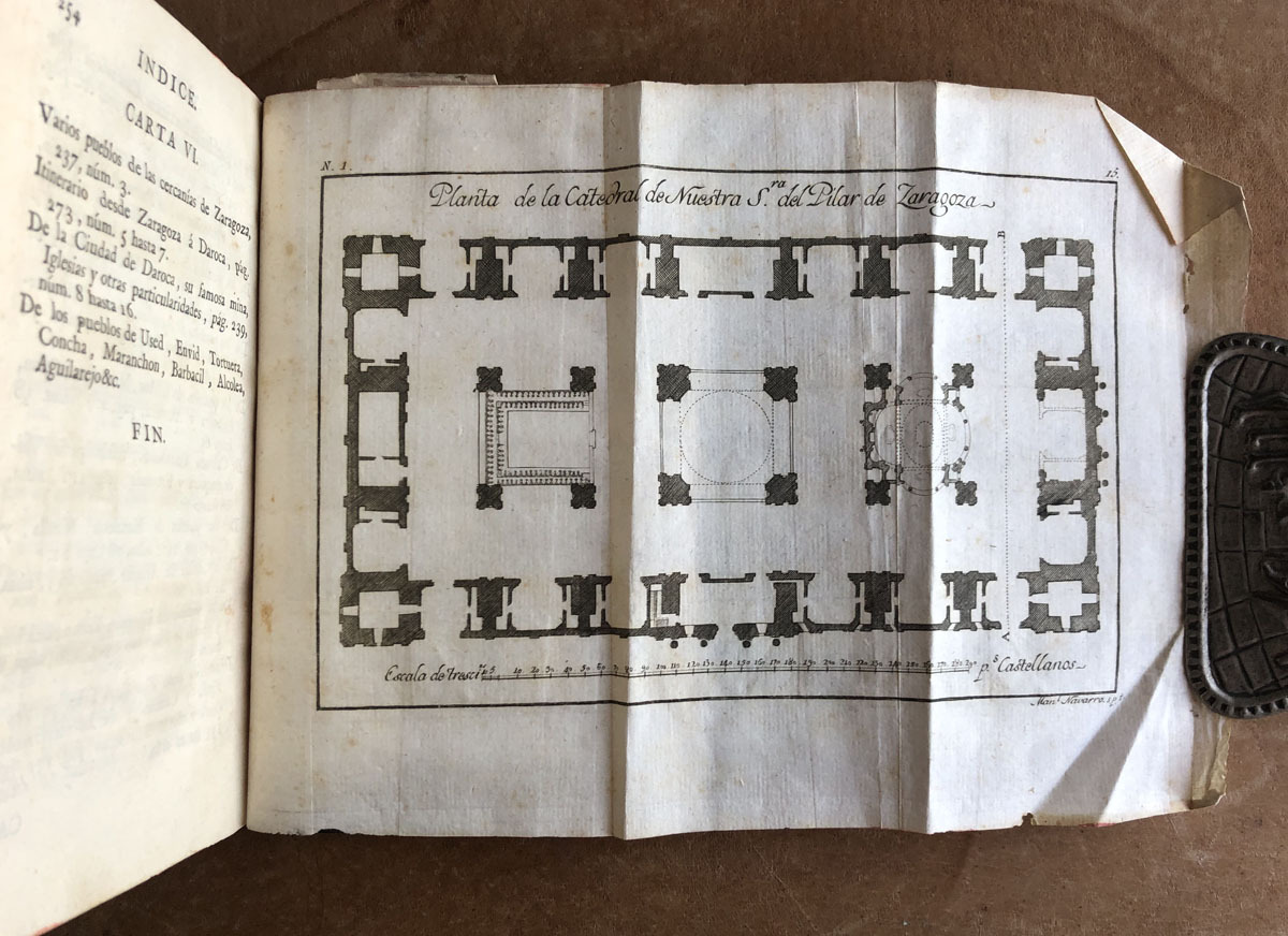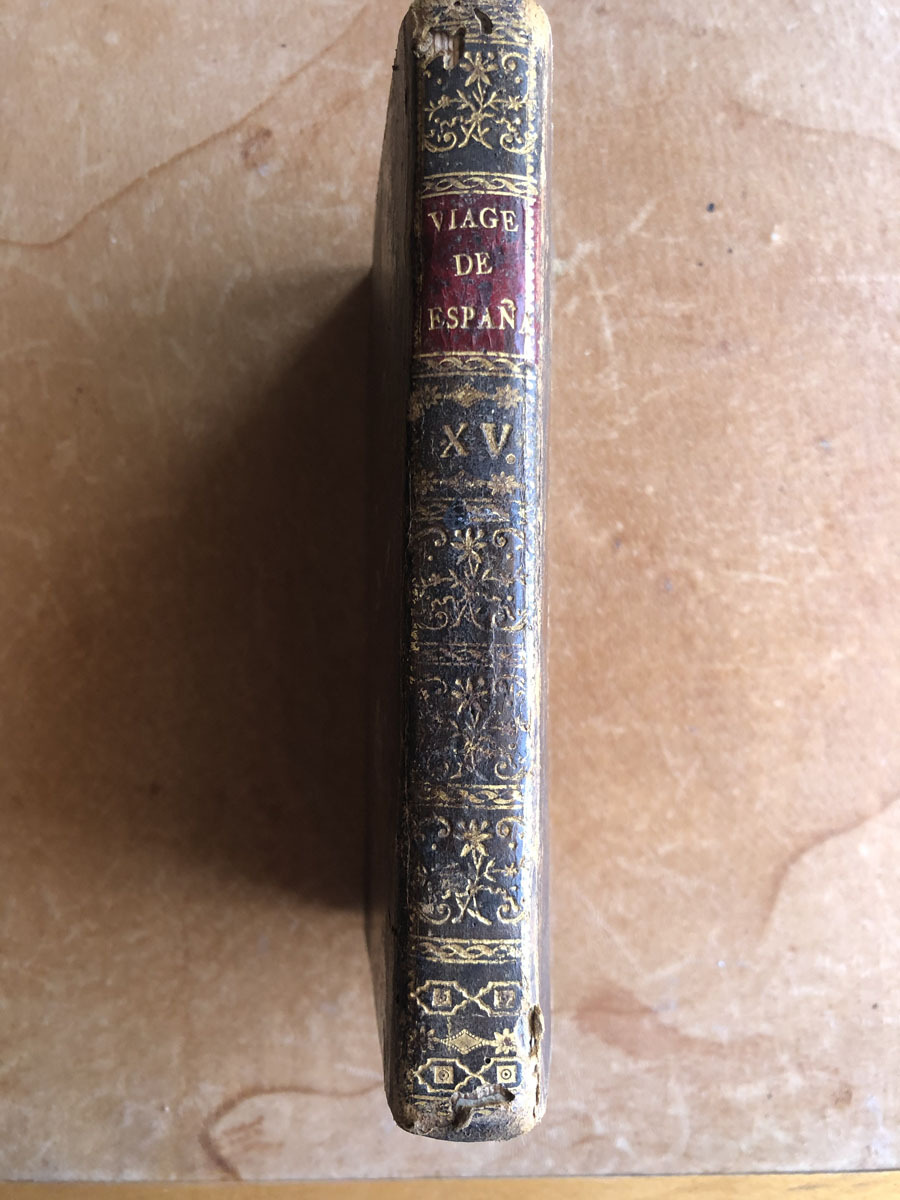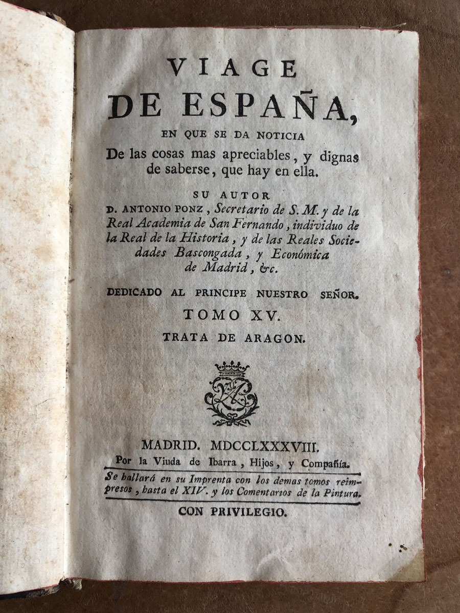 Viage // de España // en que se da noticia // De las cosas mas apreciables, y dignas // de saberse, que hay en ella. // su autor // D. Antonio Ponz, Secretario de S. M. y de la // Real Academia de San Fernando, individuo de la // Real de la Historia, y de las Reales Socie- // dades Bascongadas, y Económica // de Madrid, etc. // Dedicado al Principe Nuestro Señor. // Tomo XV// Trata de Aragon. // Madrid MDCCLXXXVIII. // Por la Viuda de Ibarra, Hijos, y Compañia. // Se hallará en su Imprenta con los demas tomos reim- // presos hasta el XIV. y los Comentarios de la Pintura. // Con privilegio.