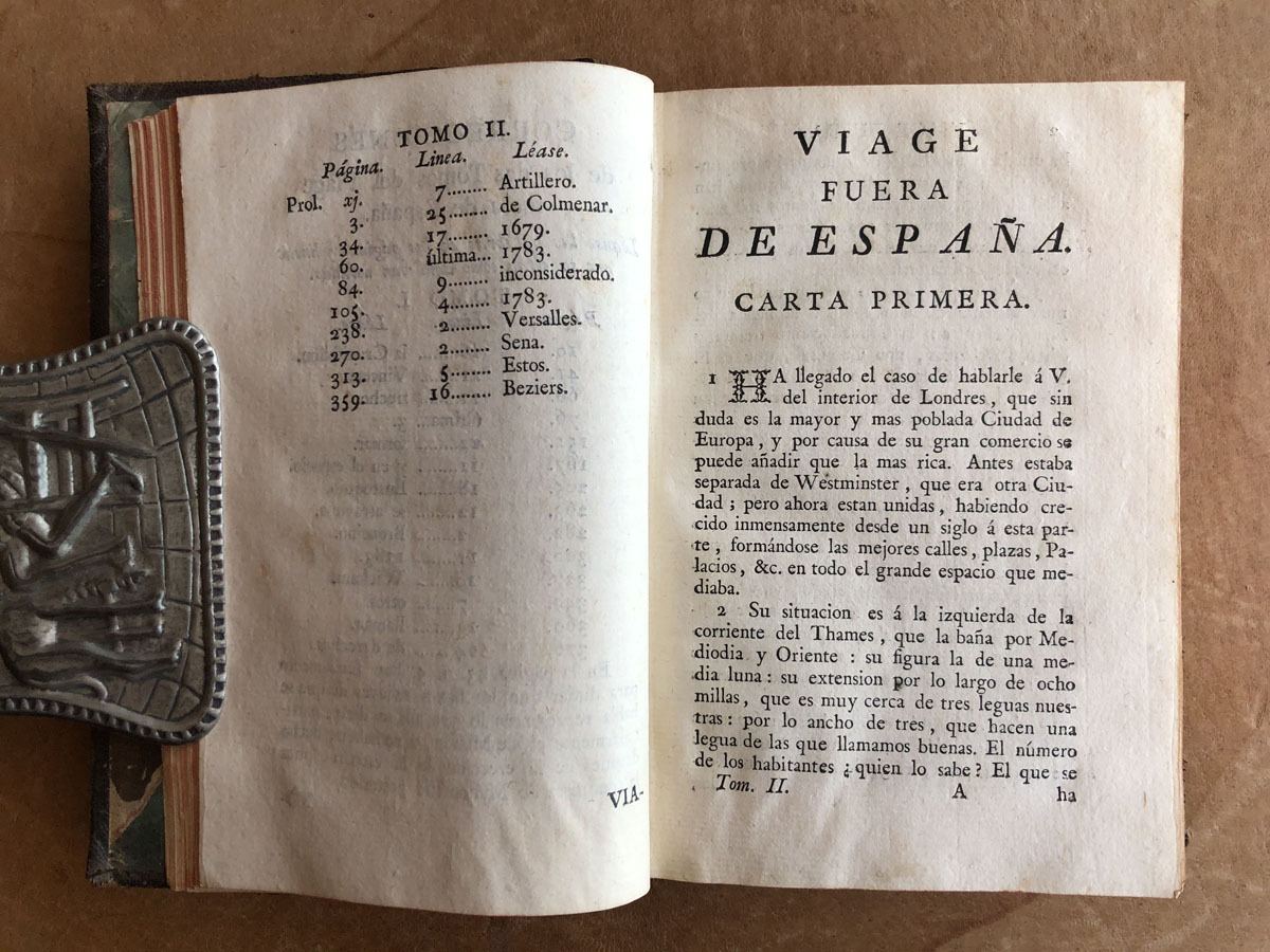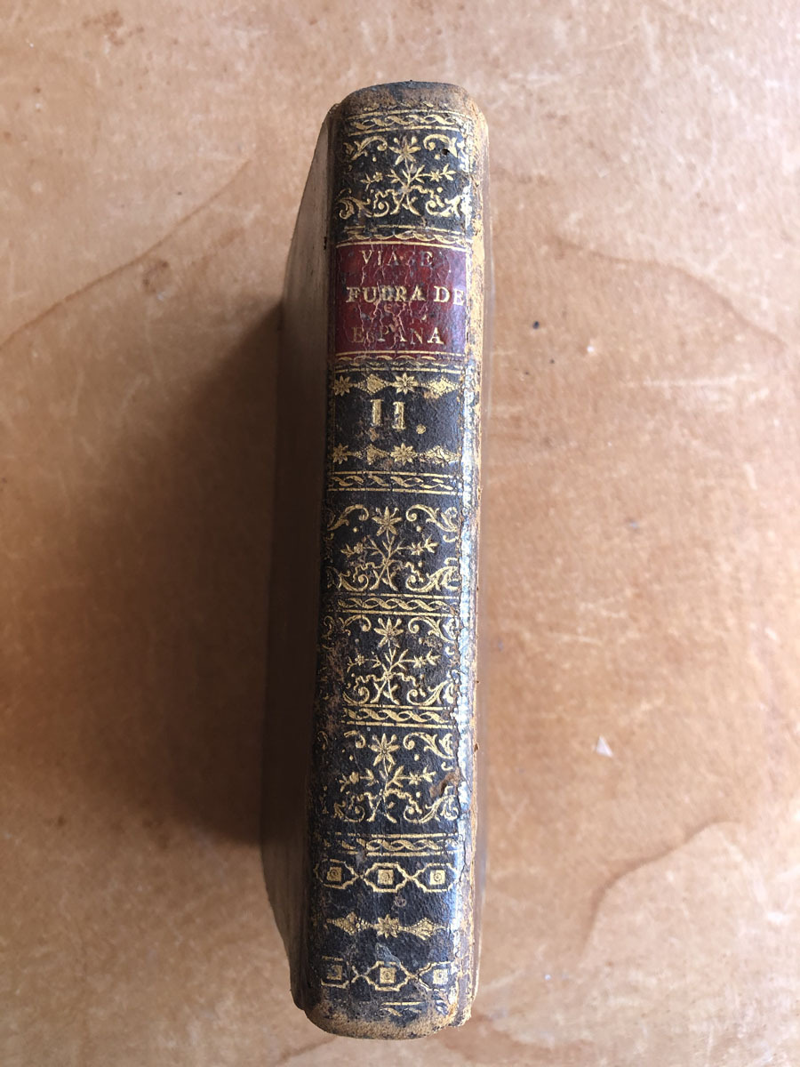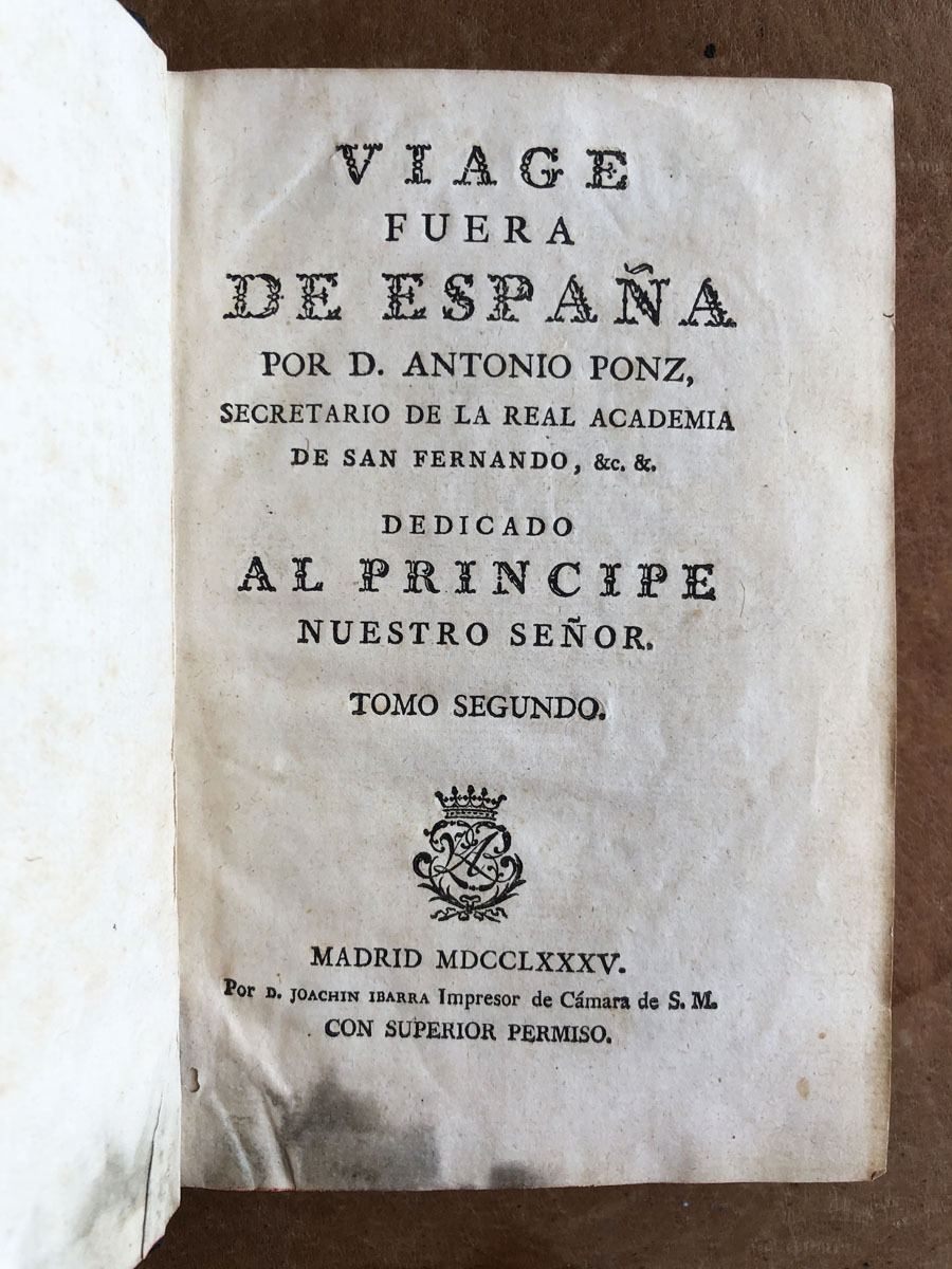 Viage // Fuera // De España // Por D. Antonio Ponz, // Secretario de la Real Academia de San Fernando, etc, etc. // Dedicado // Al Principe // Nuestro Señor. // Tomo Segundo // Madrid MCCLXXXV. // Por D. Joachin Ibarra Impresor de Cámara de S.M. // Con Superior Permiso. //