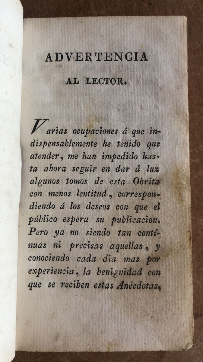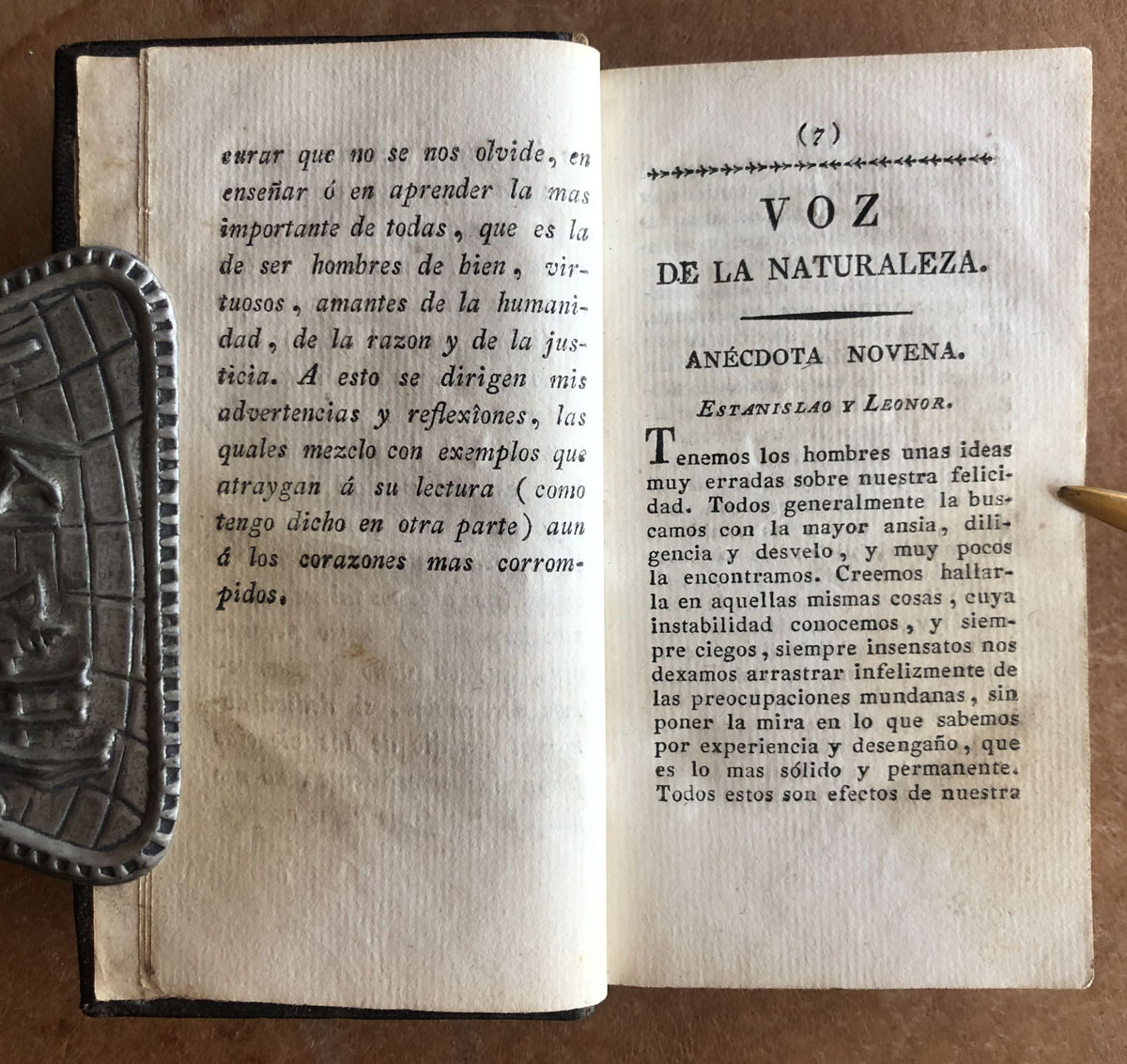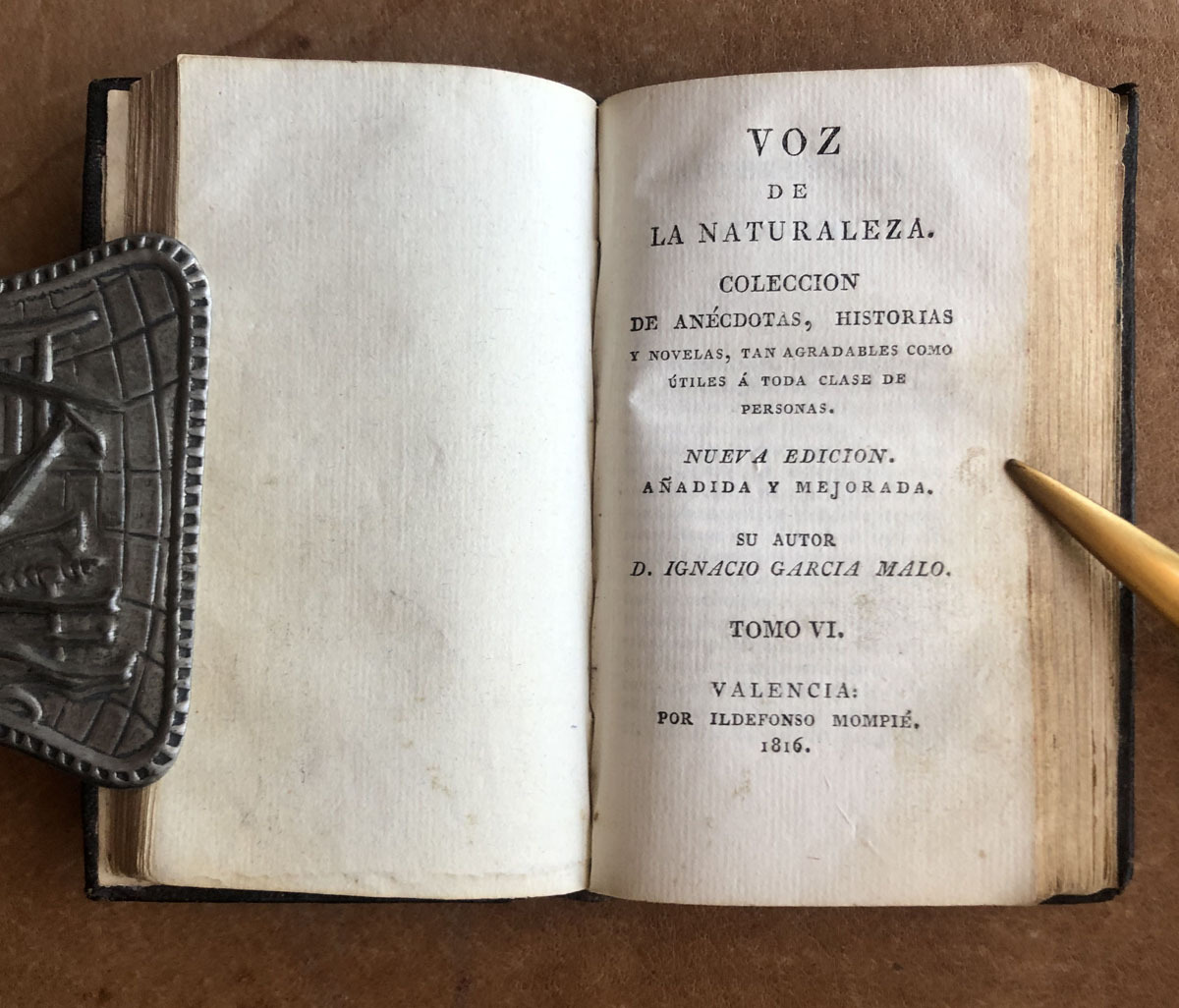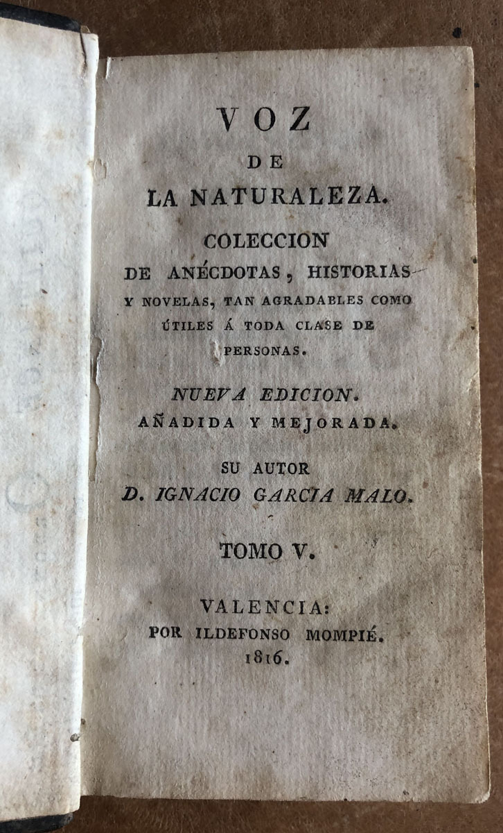 Voz // de // la Naturaleza. // Colección // de anécdotas, Histórias // y Novelas, tan agradable como útiles á toda clase de // personas. // Nueva Edición // añadida y Mejorada. // su autor // D. Ignacio García Malo. // Tomo V. [ & VI] // Valencia: // Por Idelfonso Monpié. // 1816